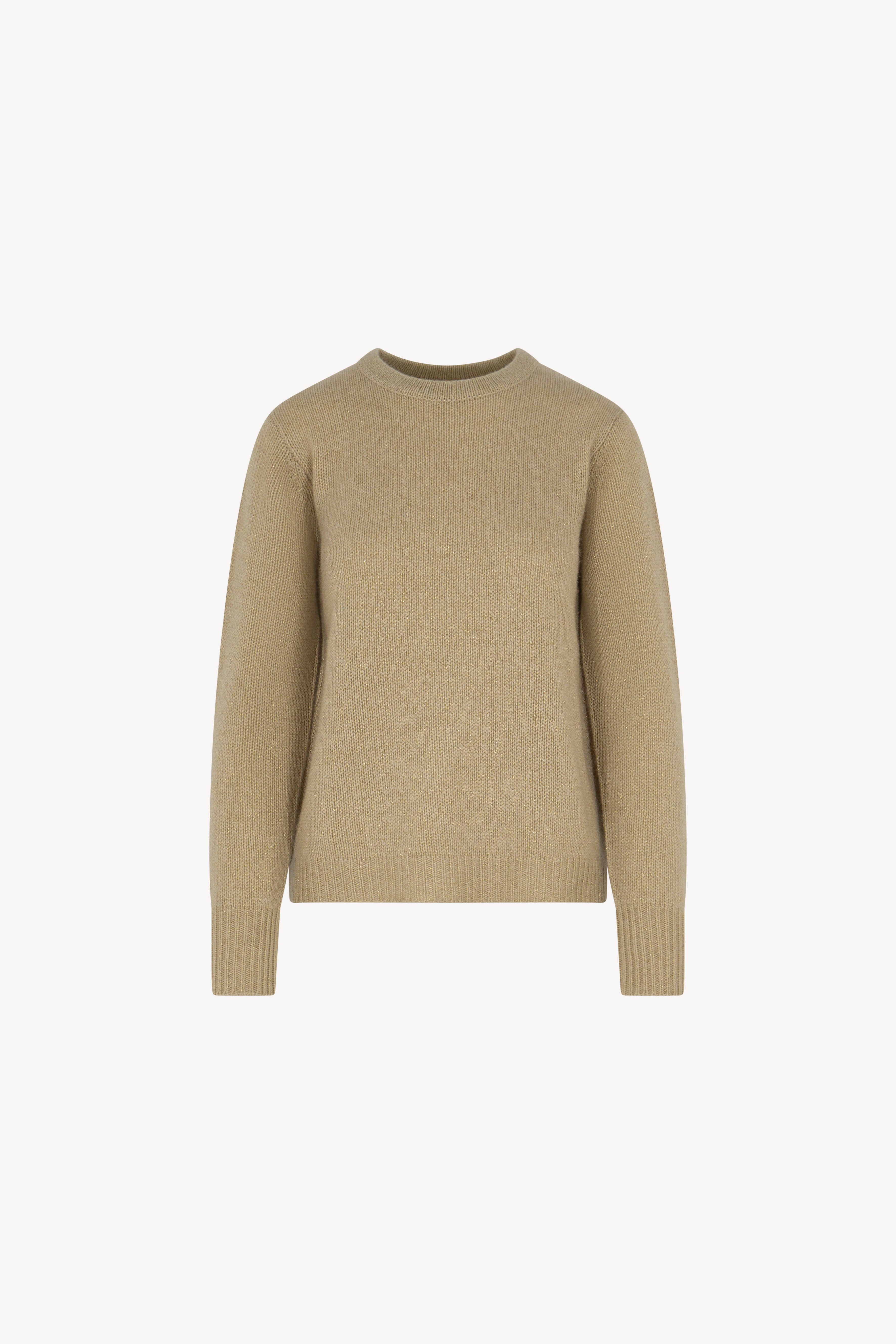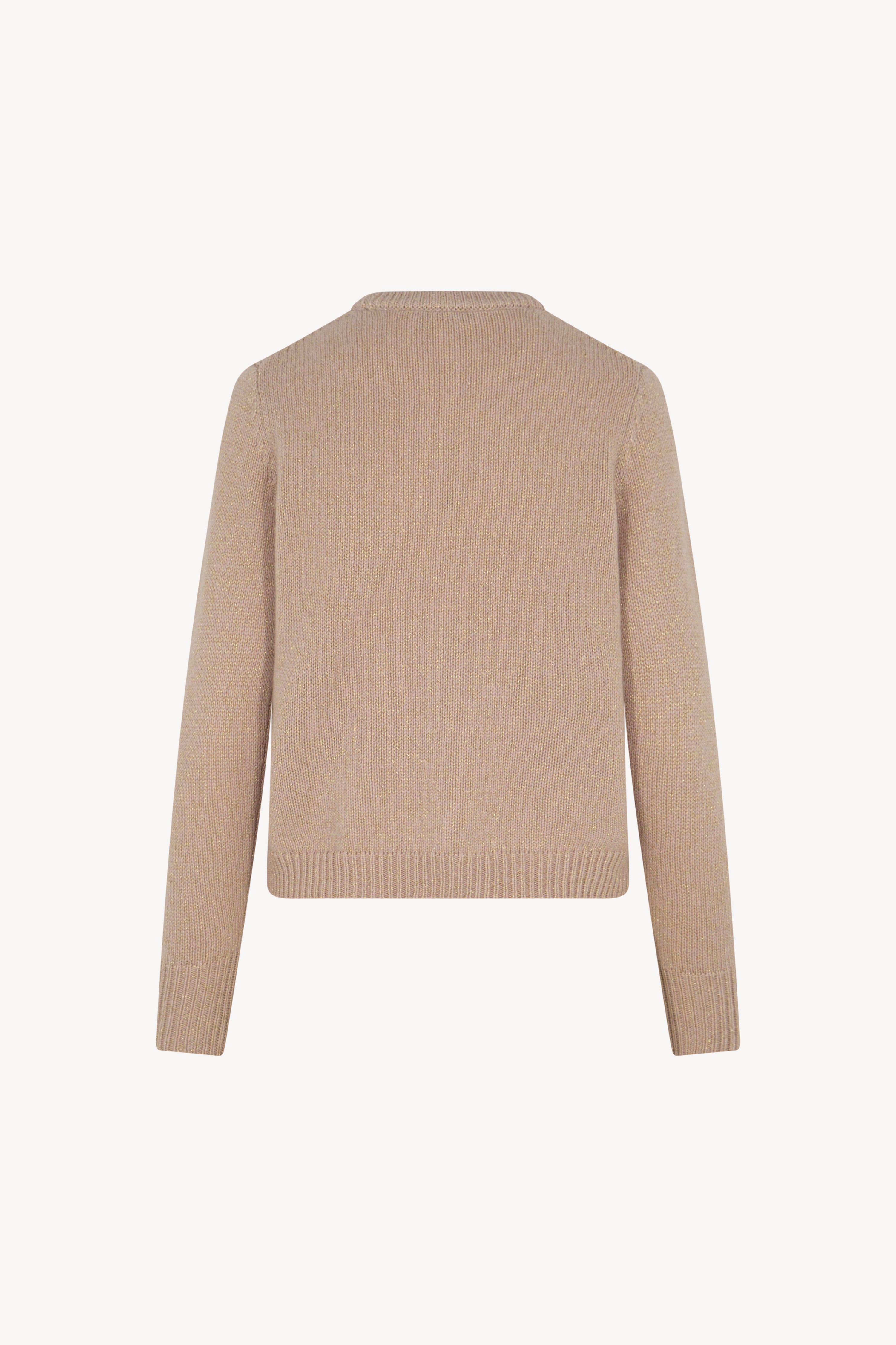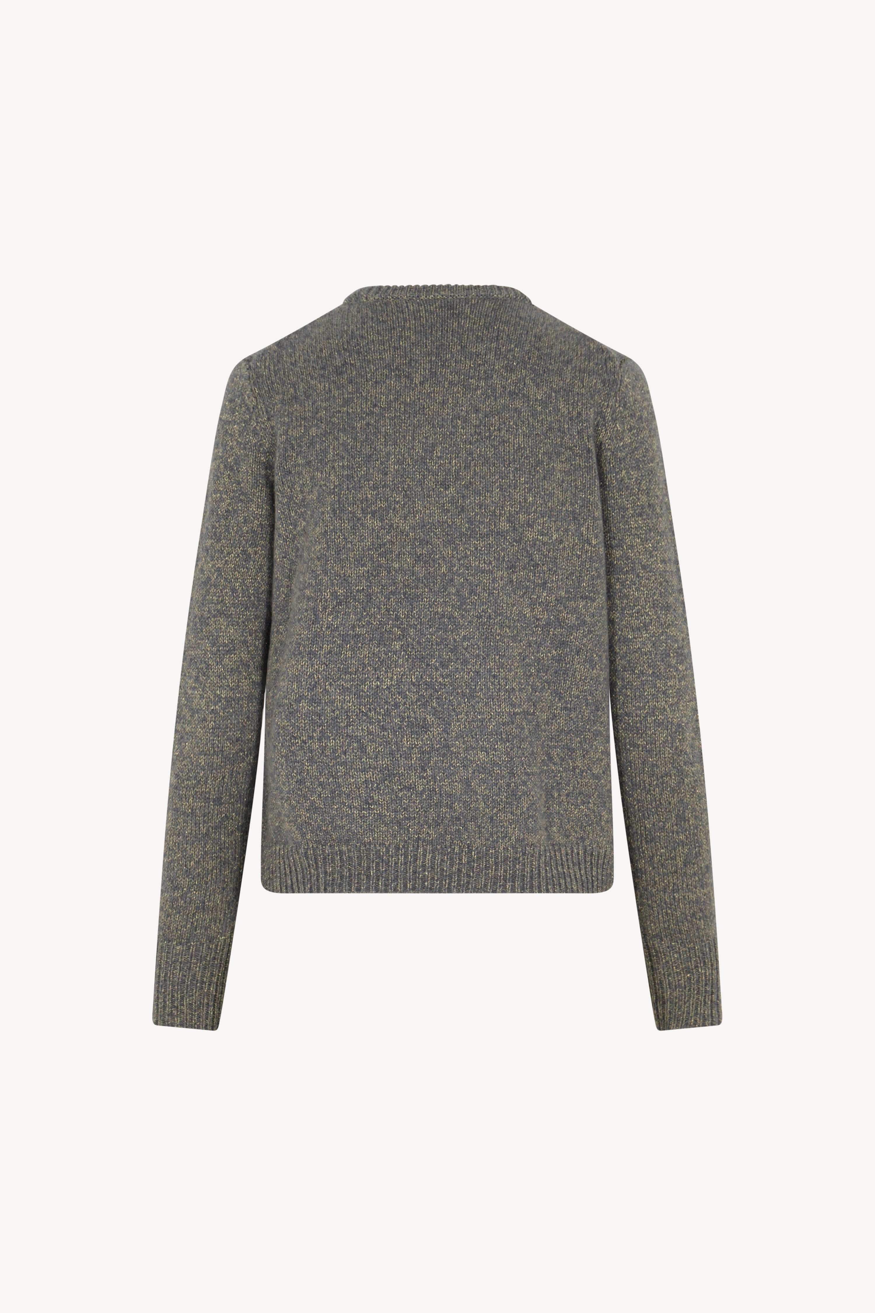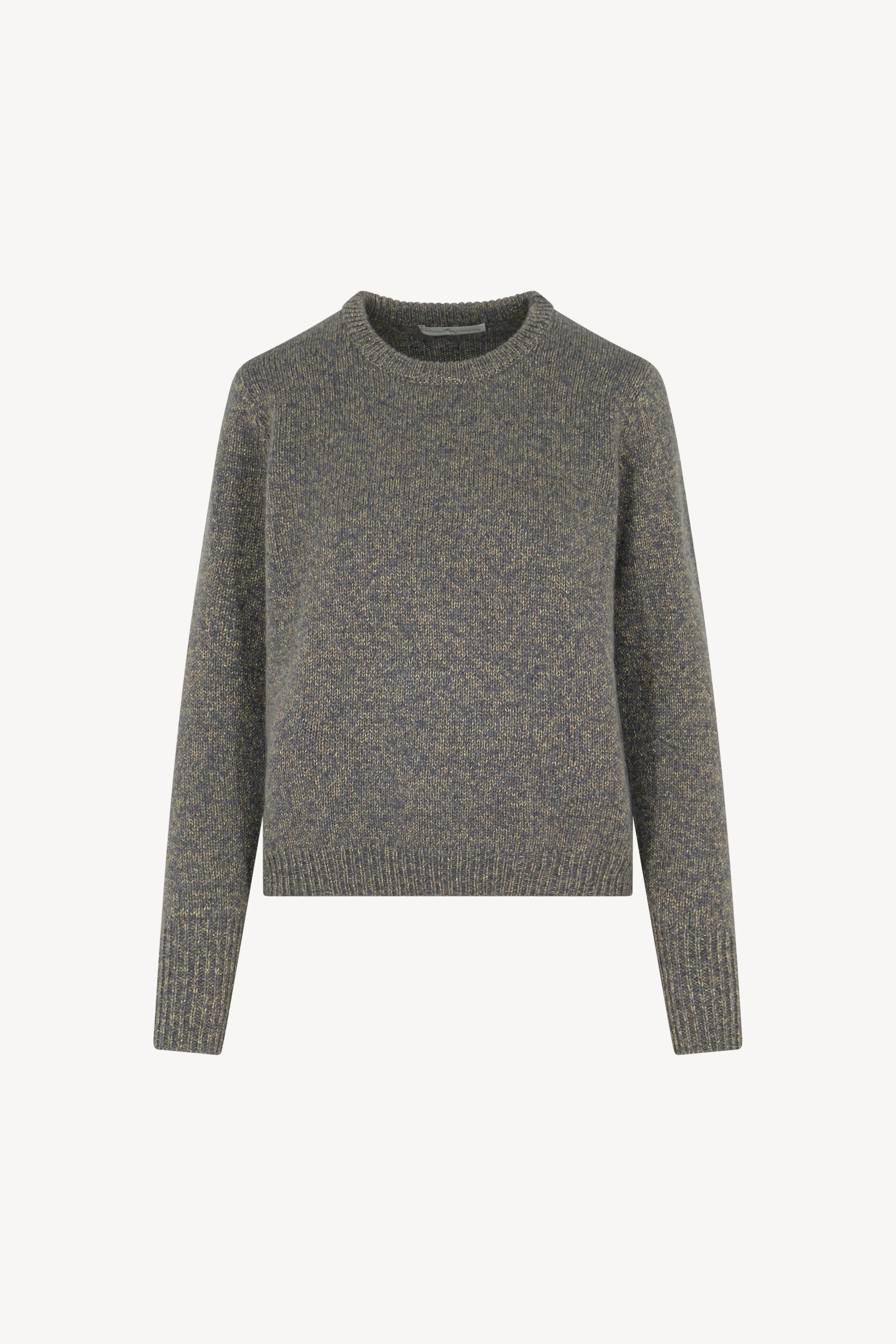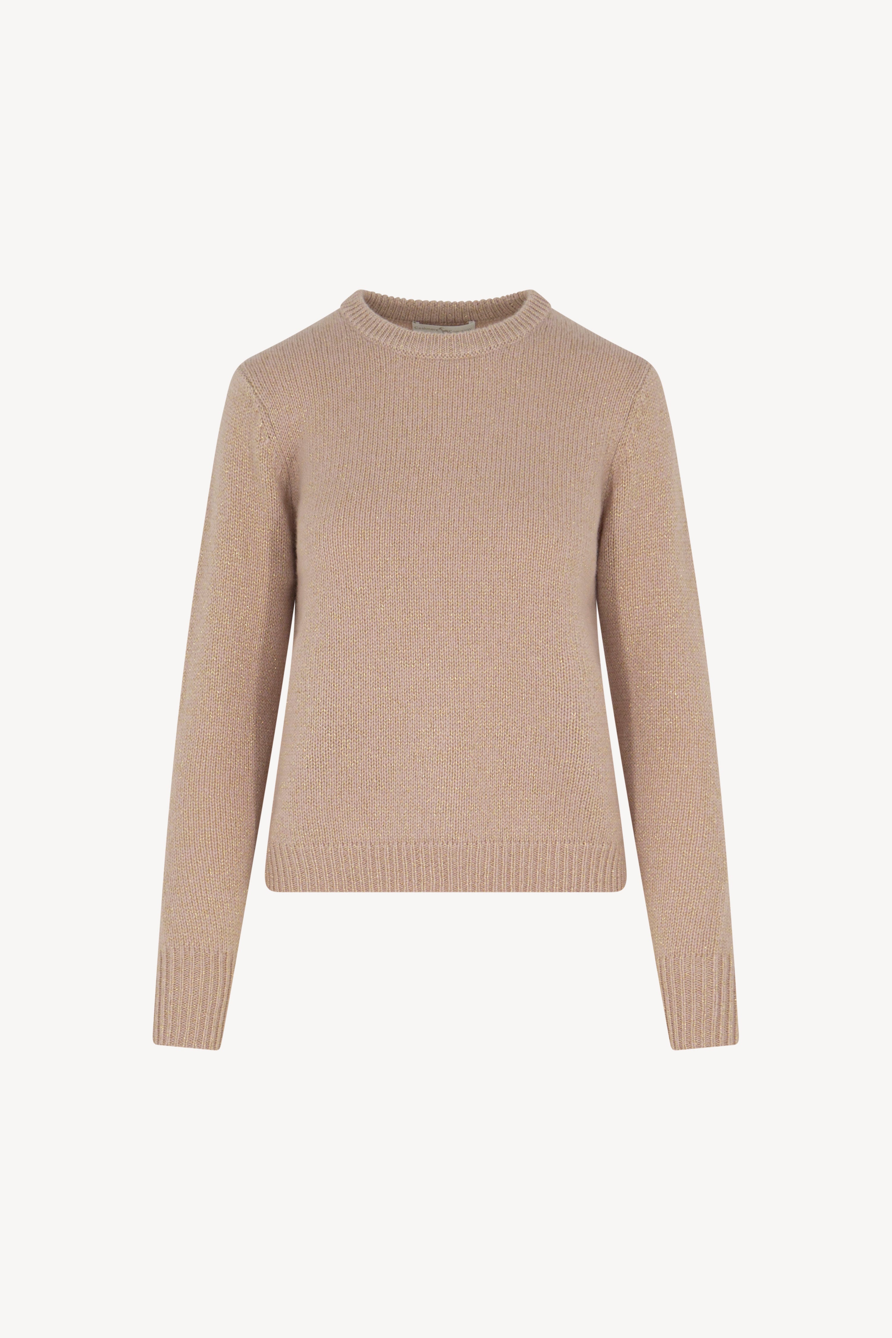 Maglia girocollo in lurex con scollo e fondi lavorati a coste. La vestibilità è regolare. Il capo è realizzato con filato 95% Cashmere 2/27 e 5% Poliestere, 3 fili.