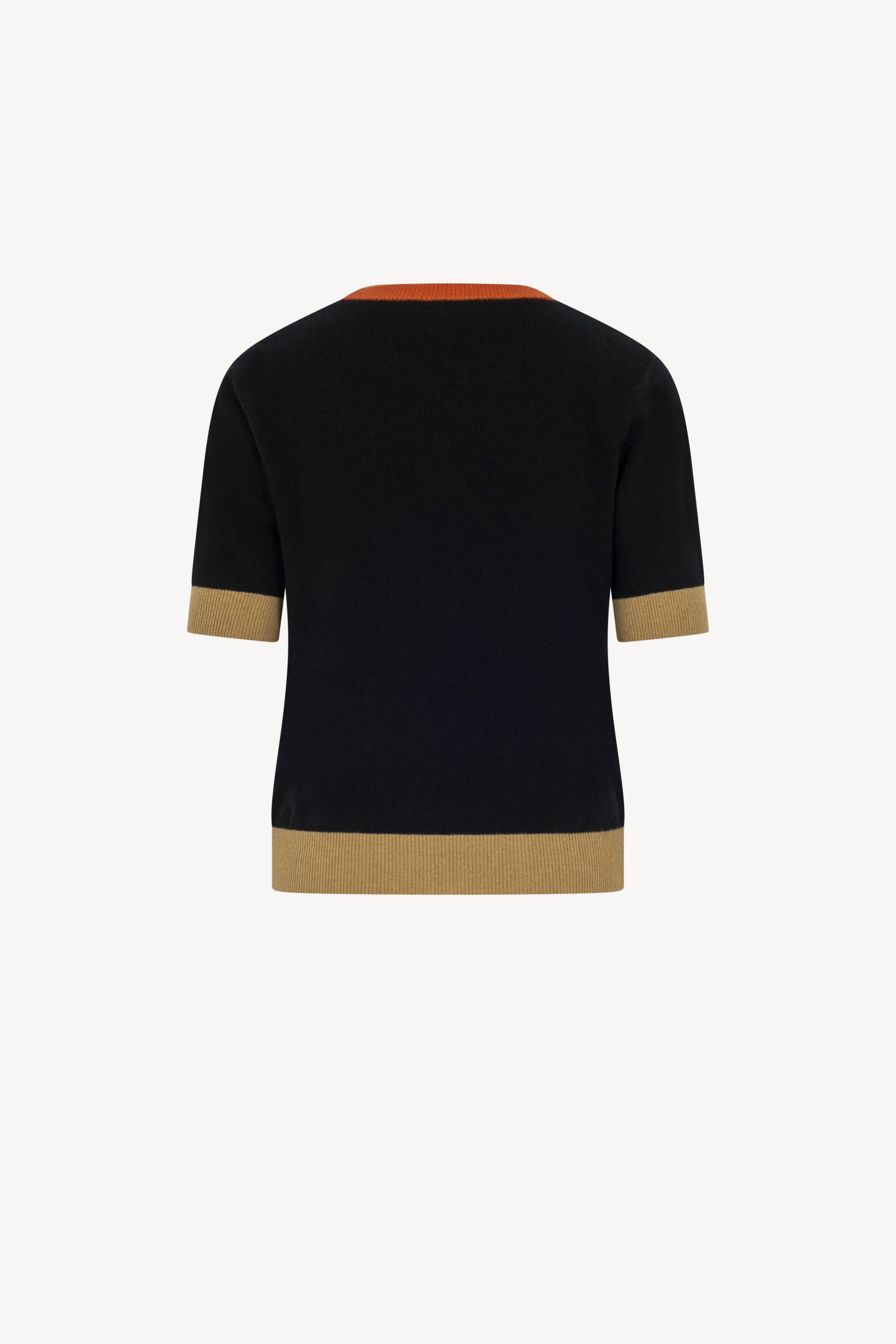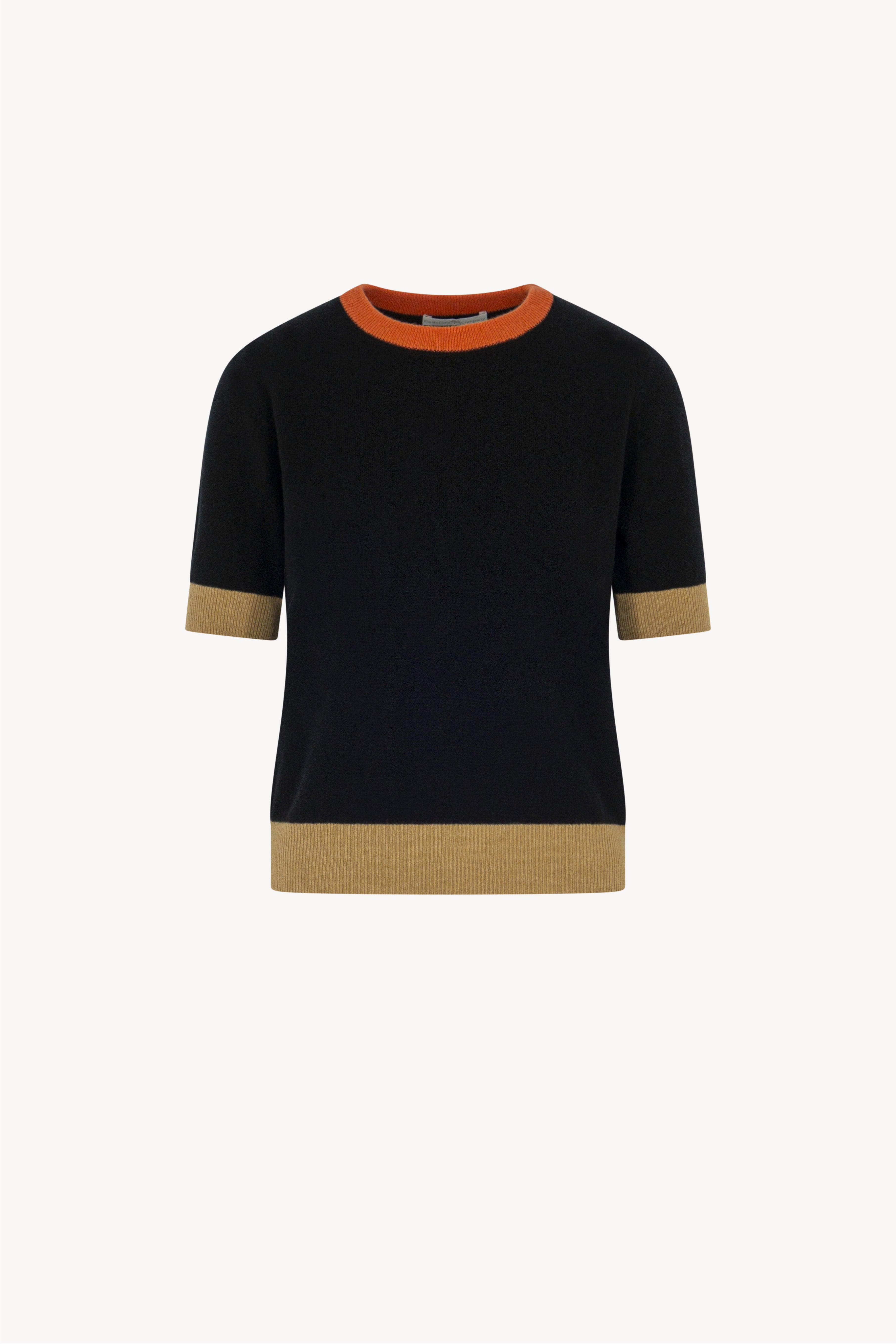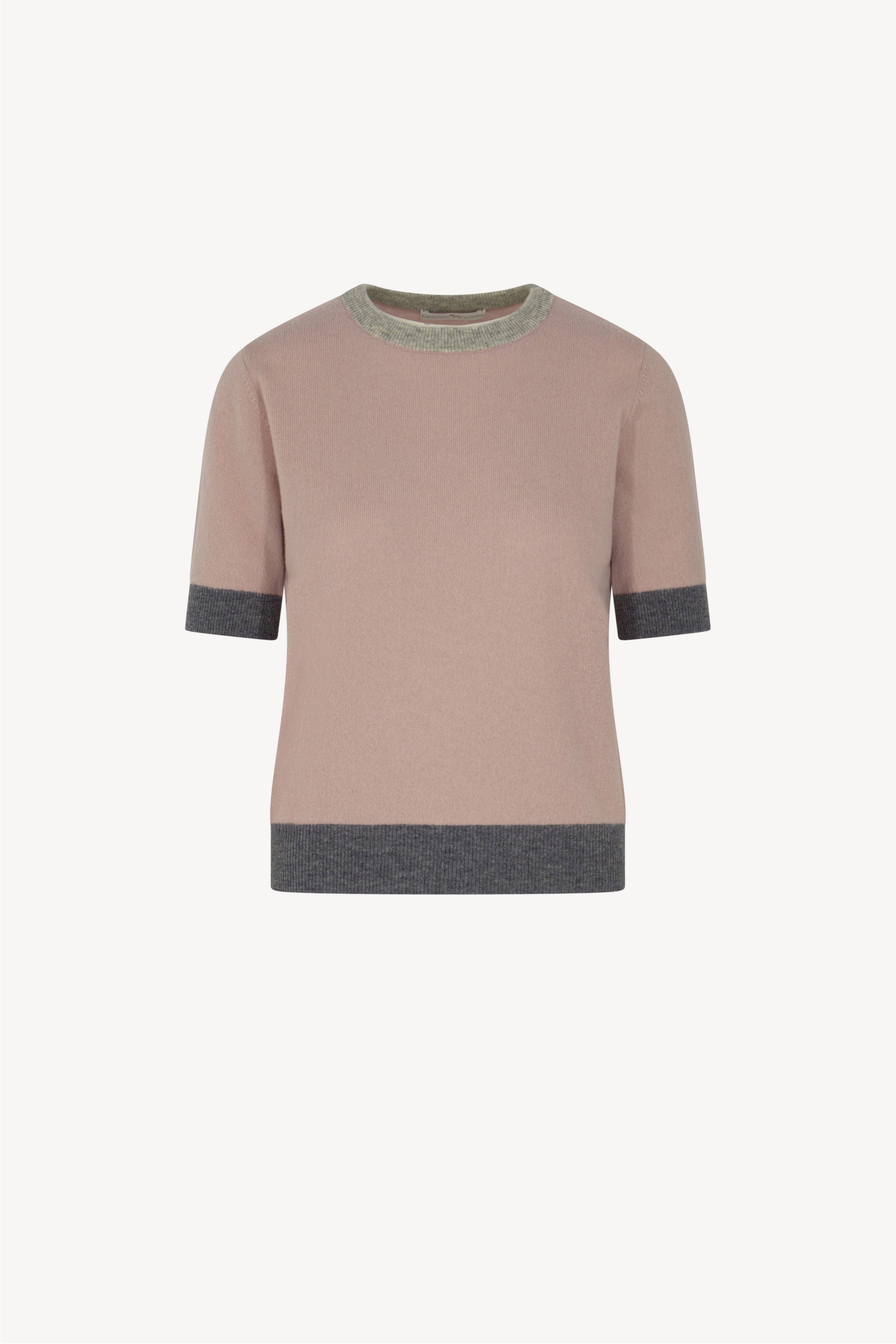 Maglia girocollo mezza manica con scollo e bordi colore a contrasto. La vestibilità è regolare. Il capo è realizzato con filato 100% Cashmere 2/27 1 filo.