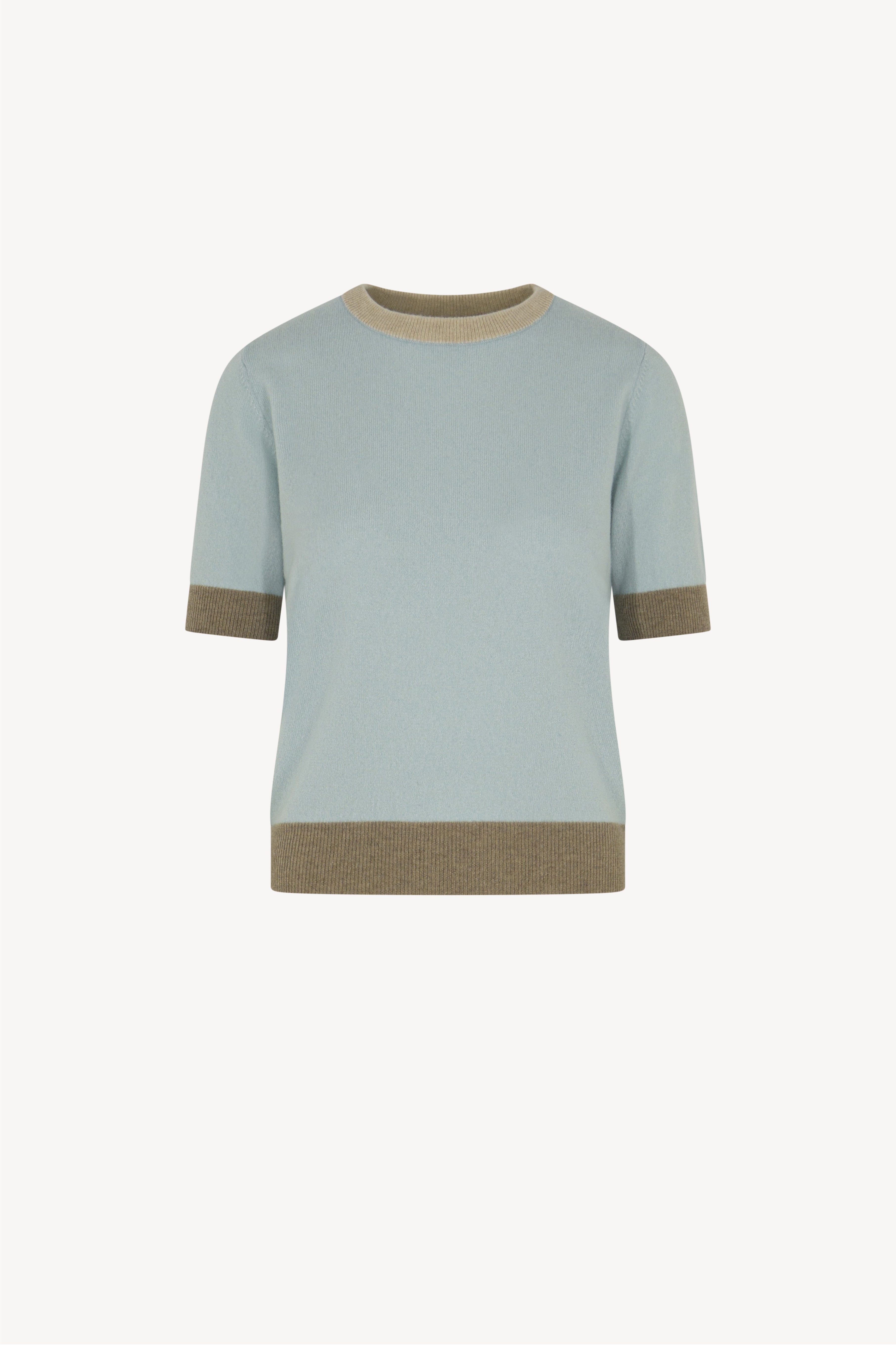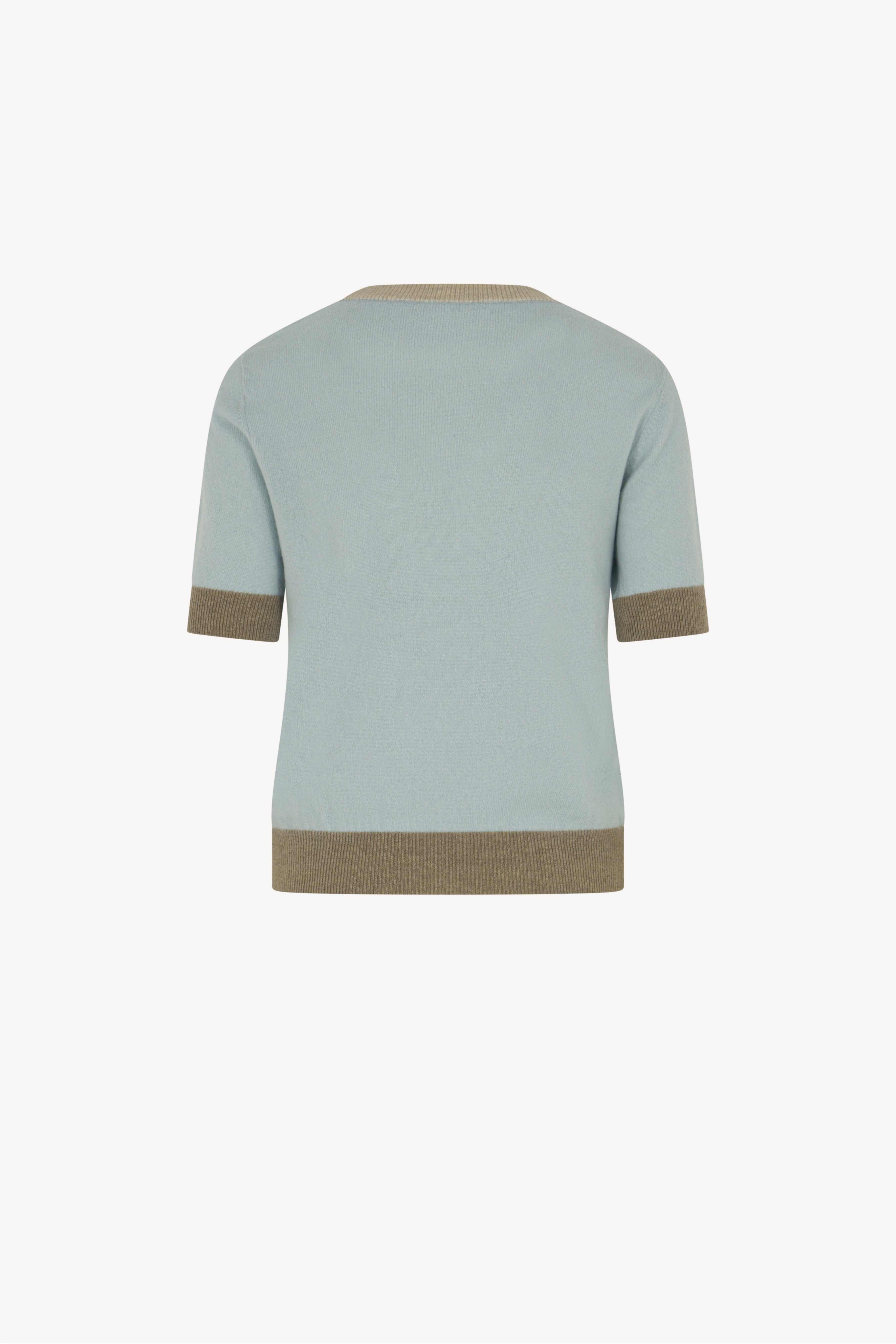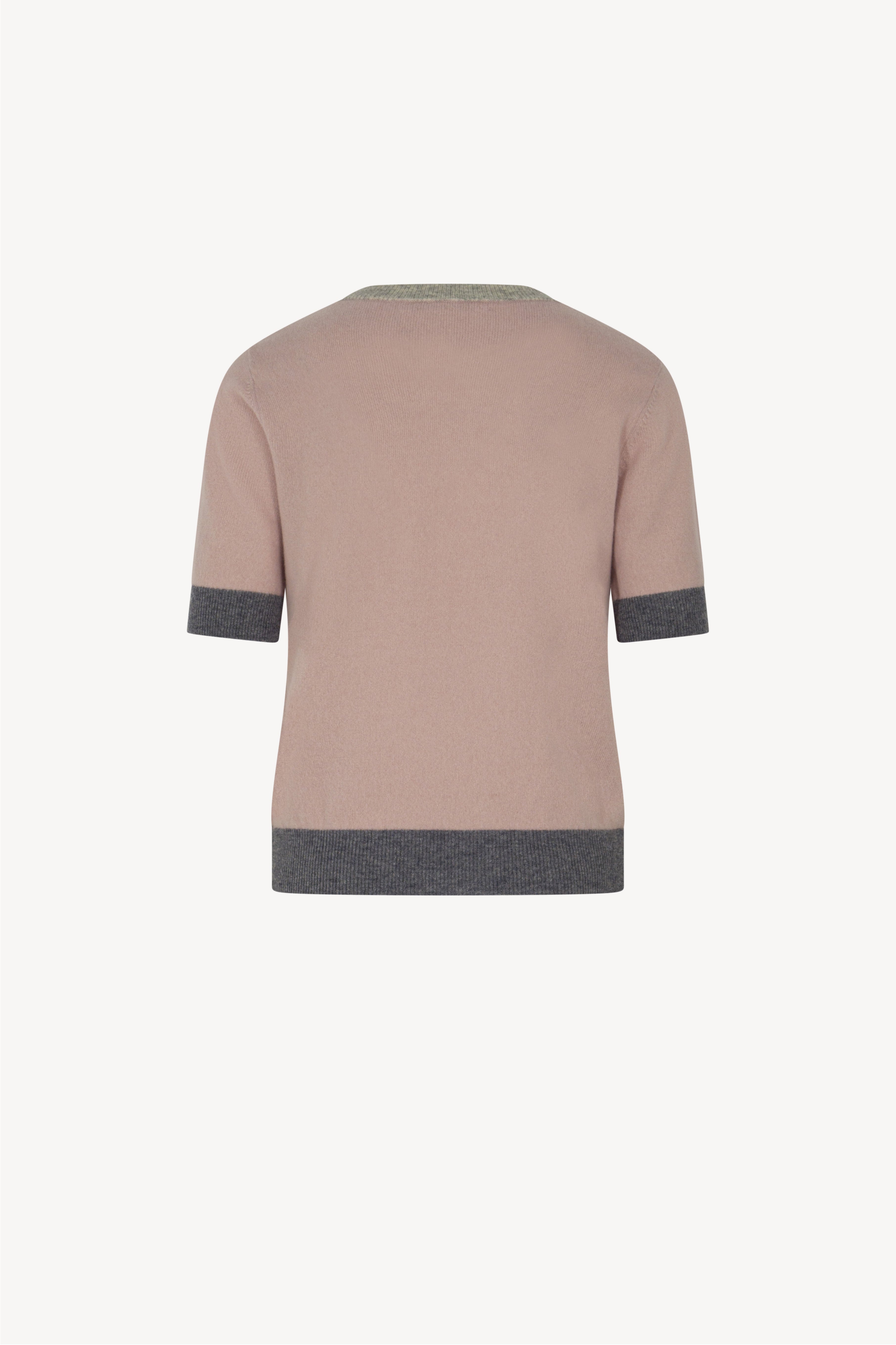 Maglia girocollo mezza manica con scollo e bordi colore a contrasto. La vestibilità è regolare. Il capo è realizzato con filato 100% Cashmere 2/27 1 filo.