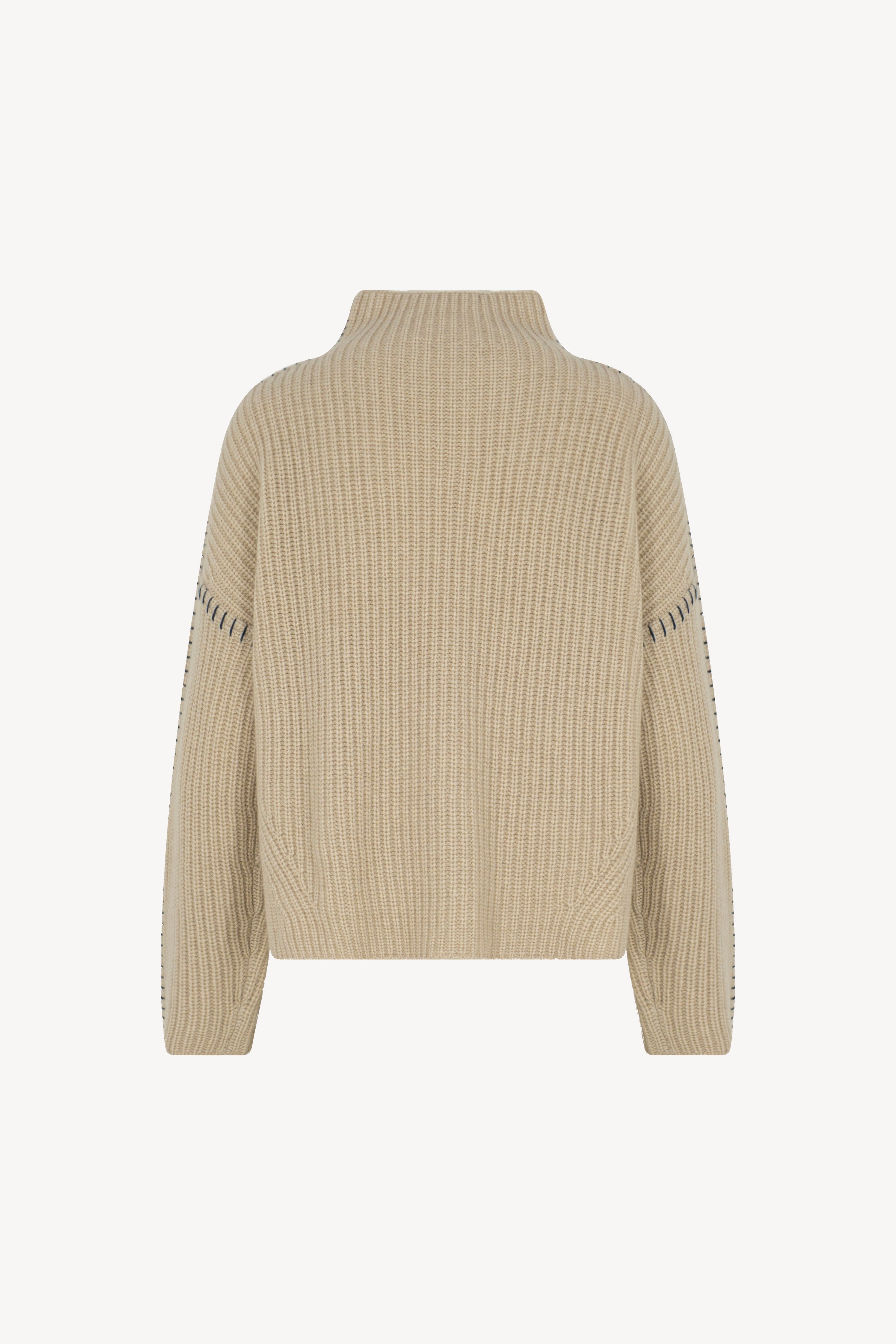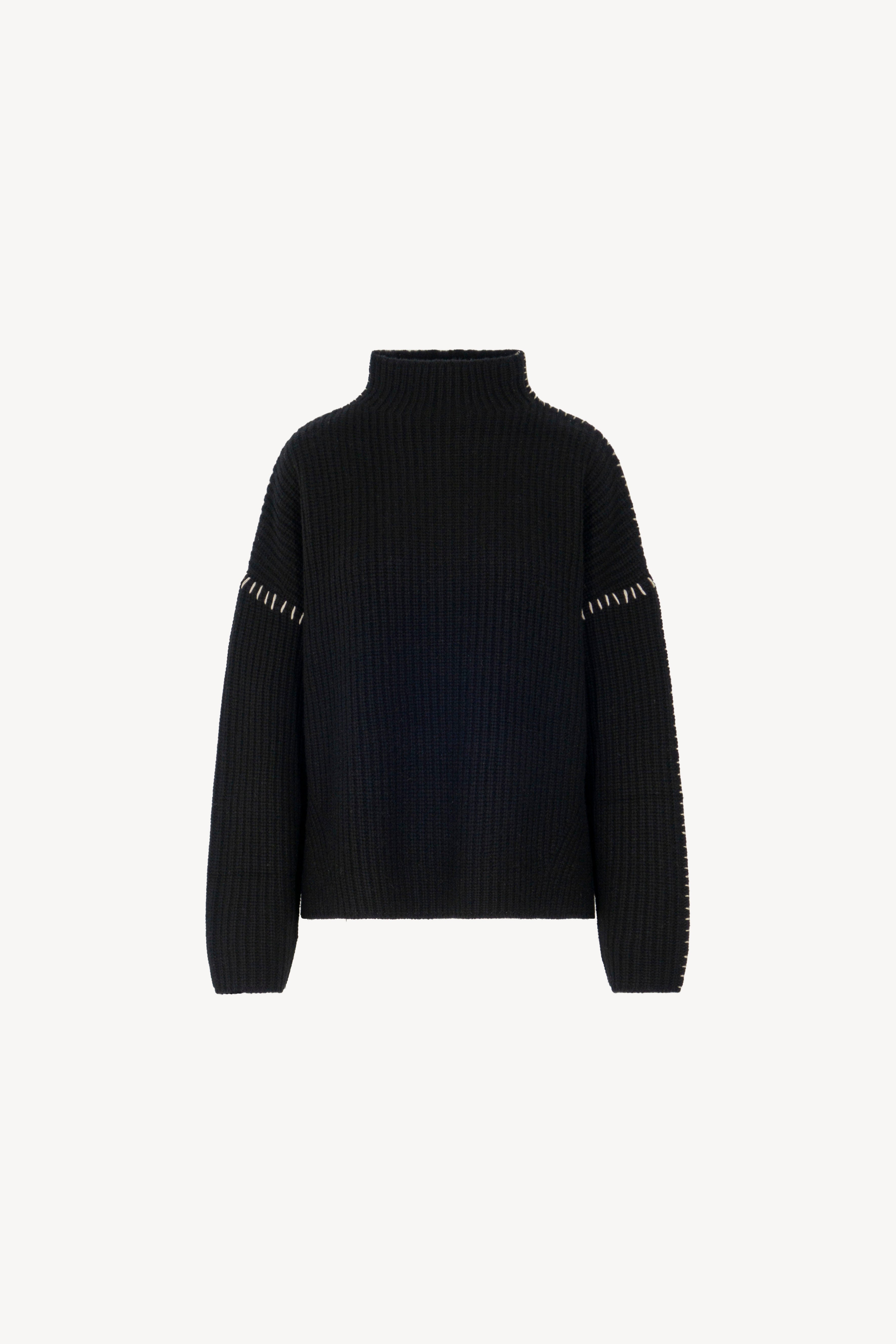 Lupetto in costa inglese, arricchito da un impuntura laterale a contrasto. La vestibilità è over. Il capo è realizzato con filato 100% Cashmere 2/27 4 fili.