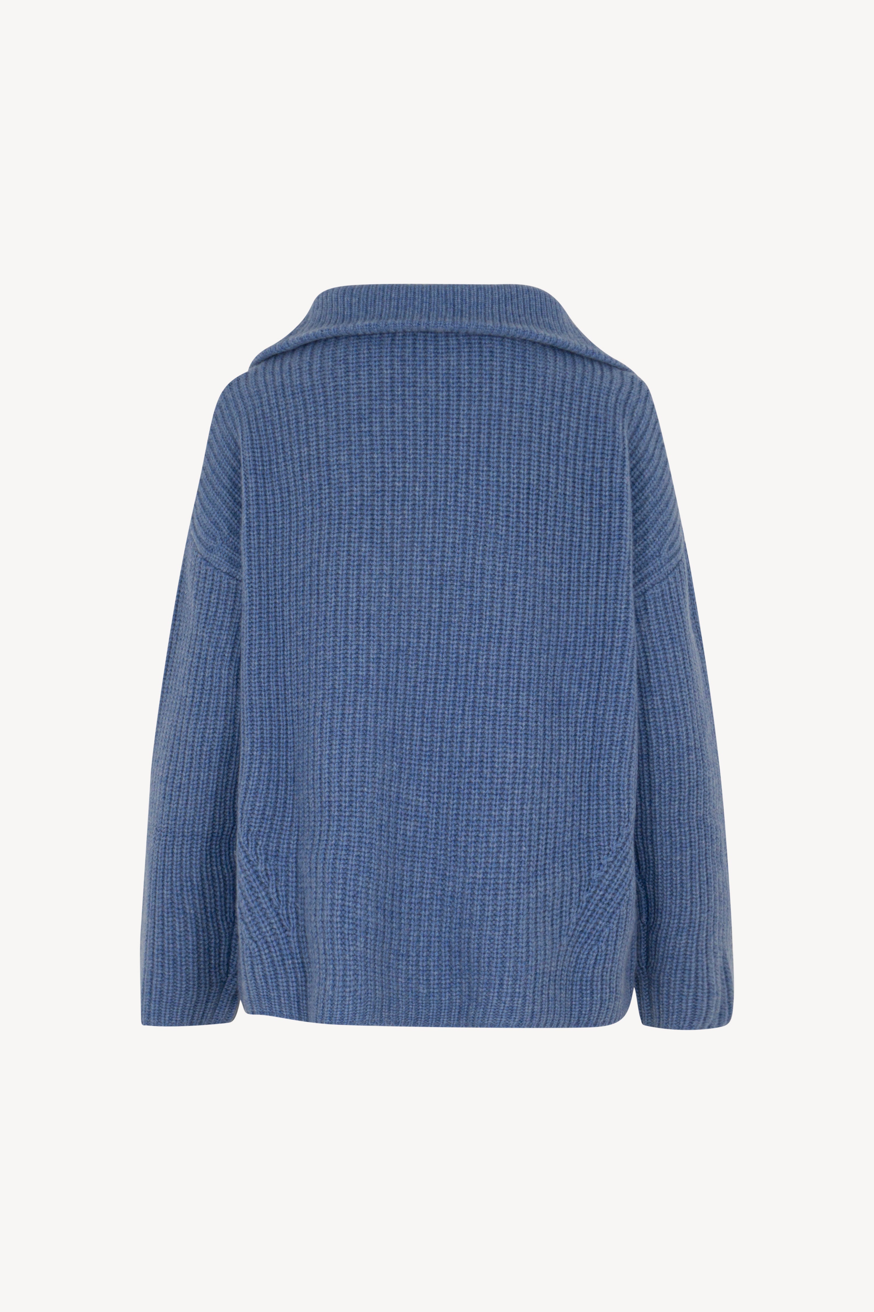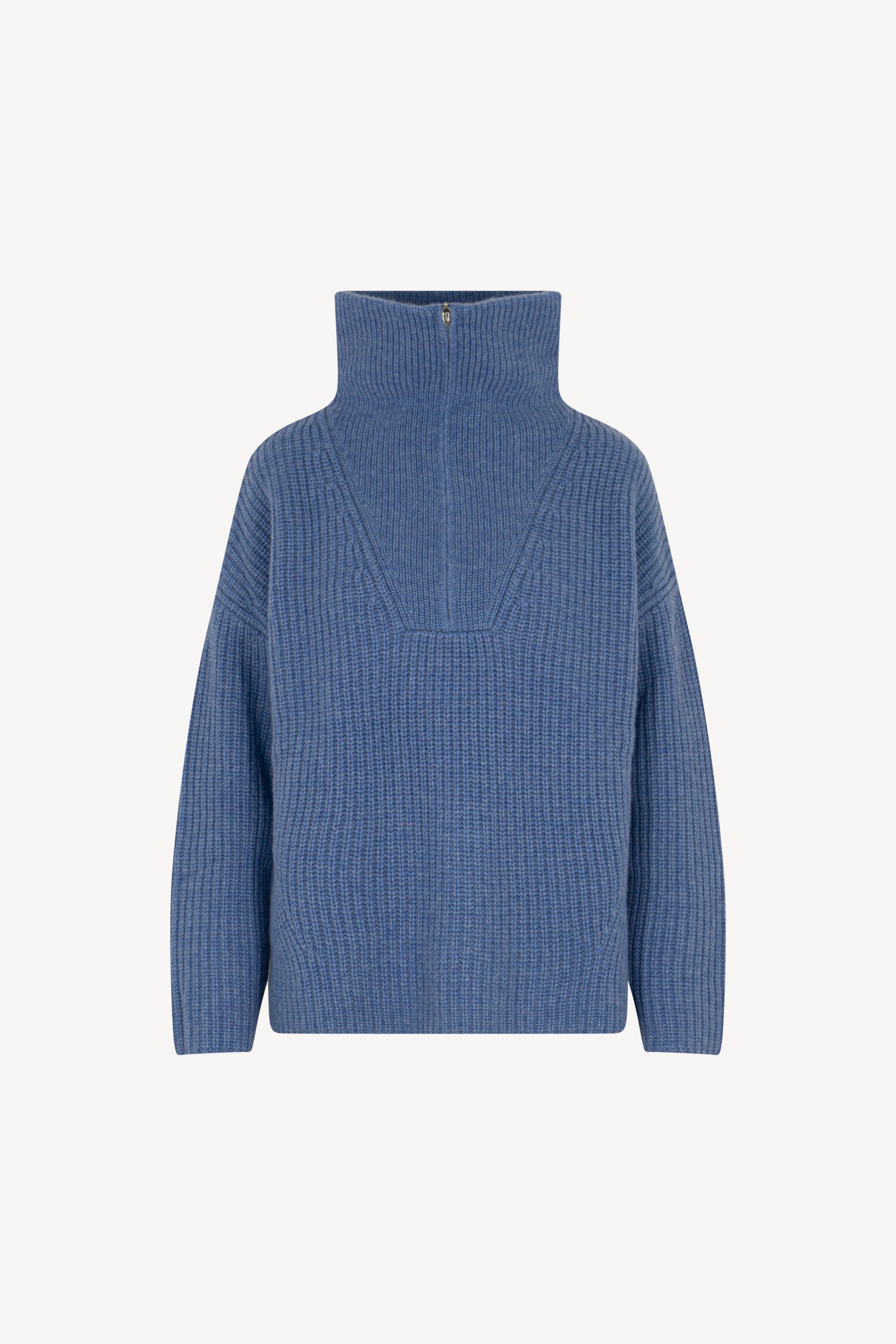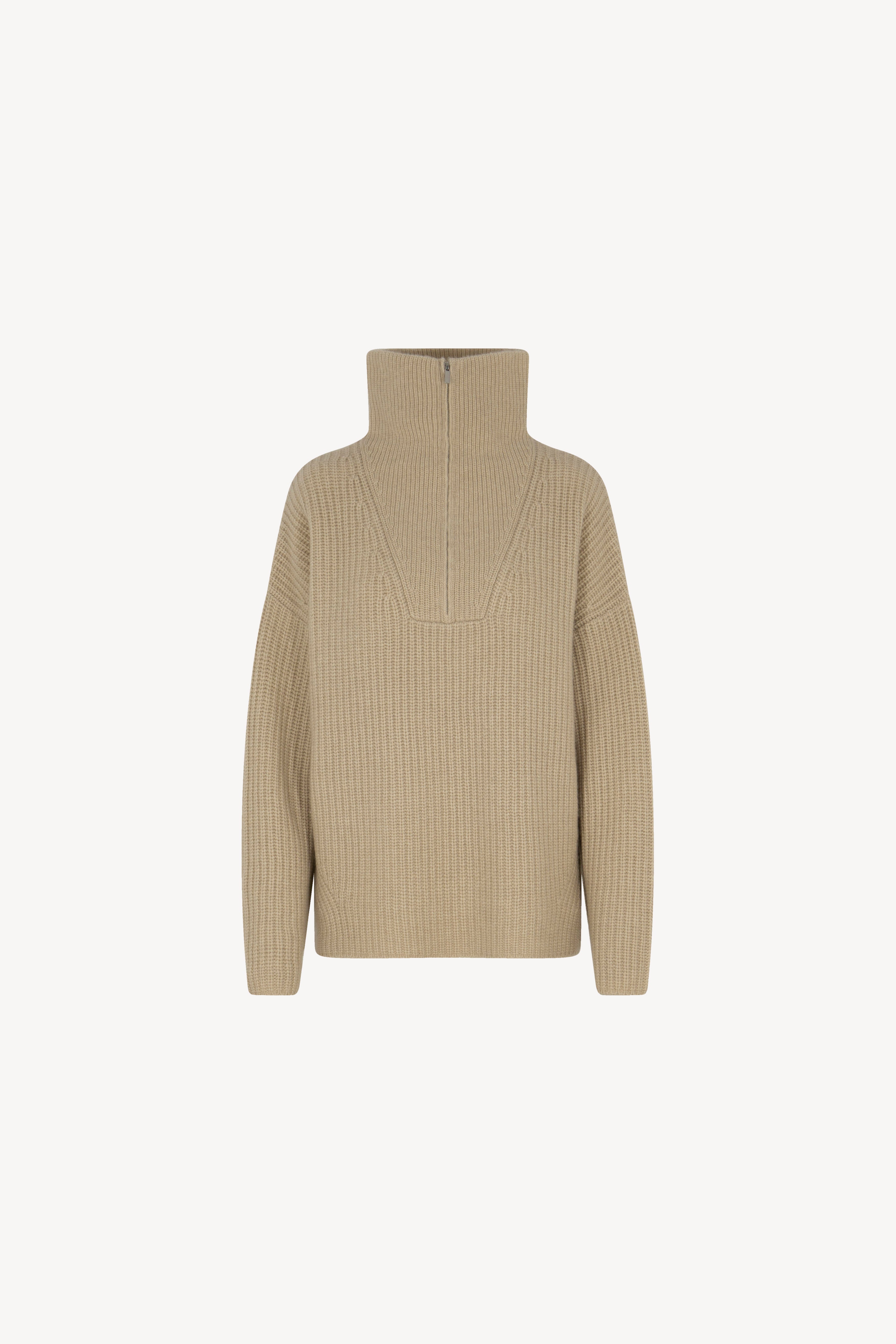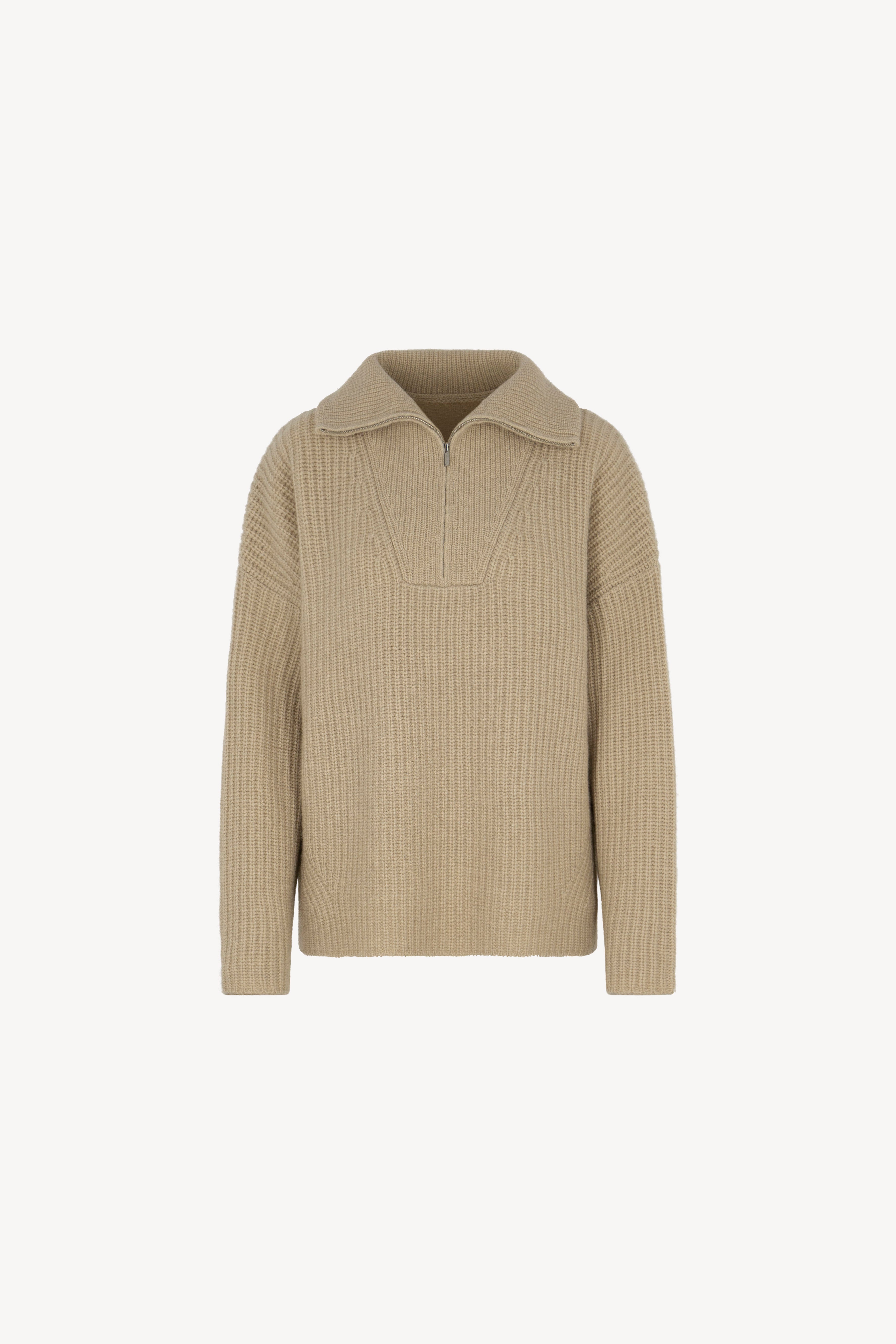 Lupetto con zip in costa inglese, arricchito da maniche scese e ampi spacchi laterali. La vestibilità è over. Il capo è realizzato con filato 100% Cashmere 2/27 4 fili.