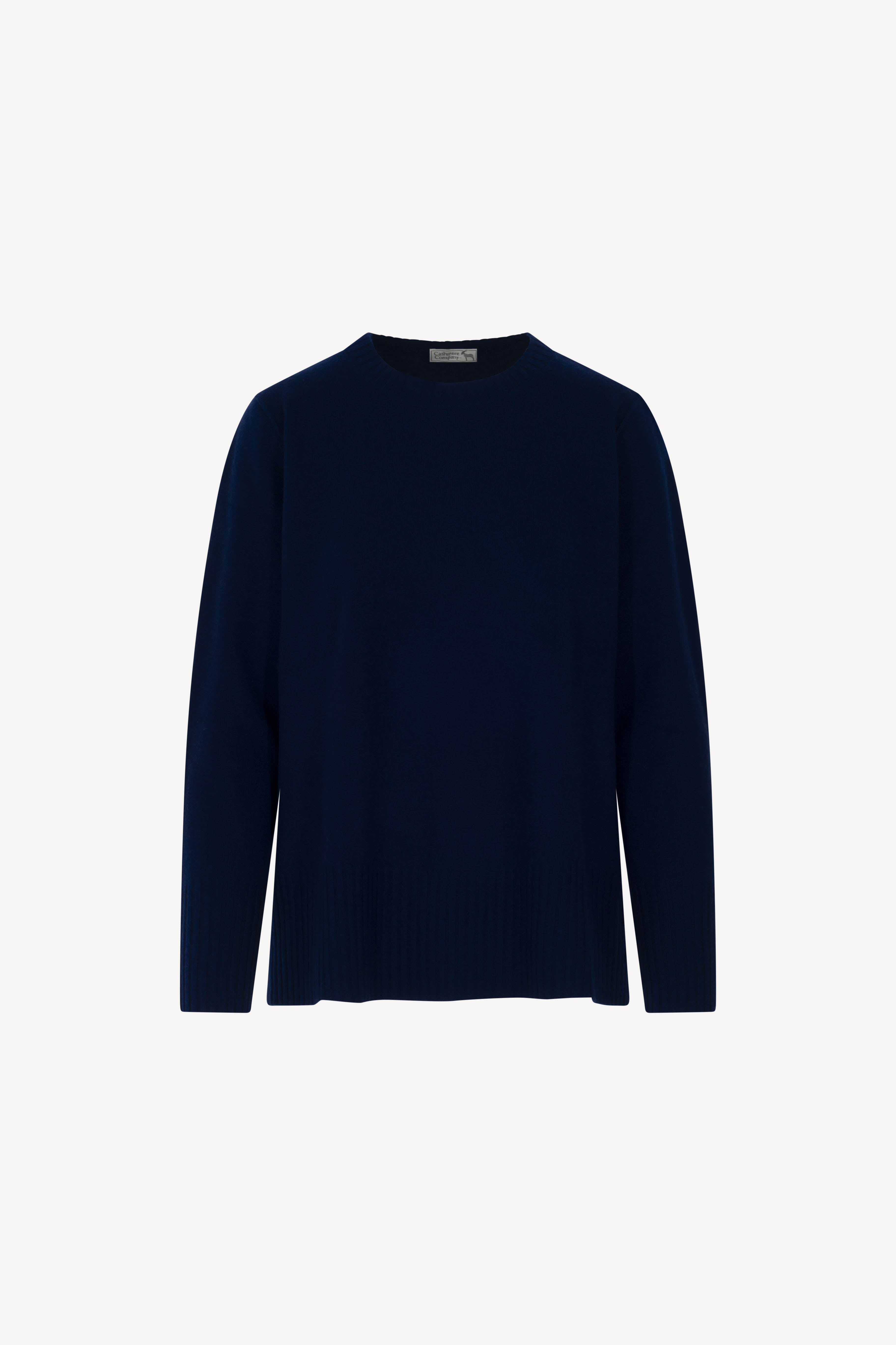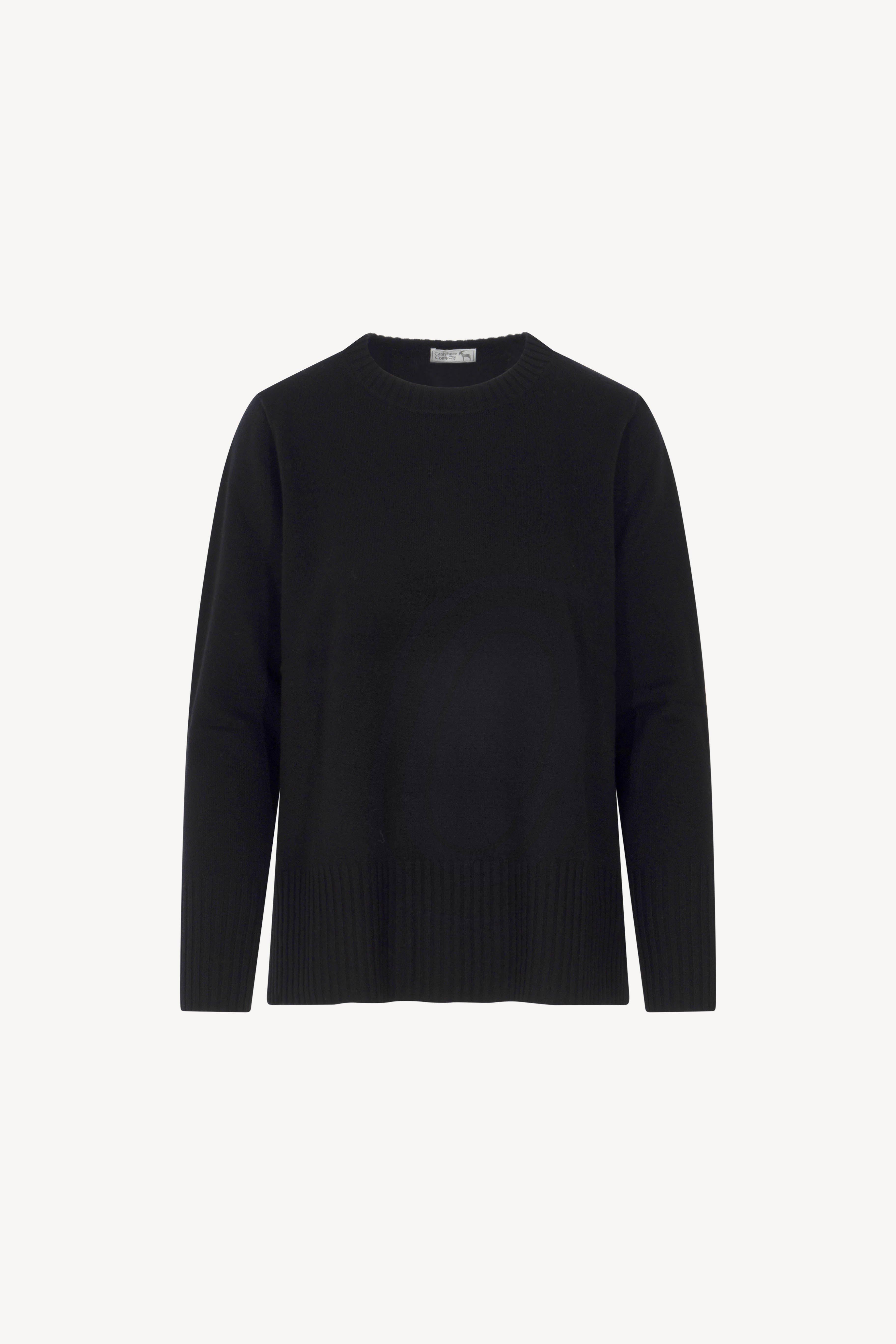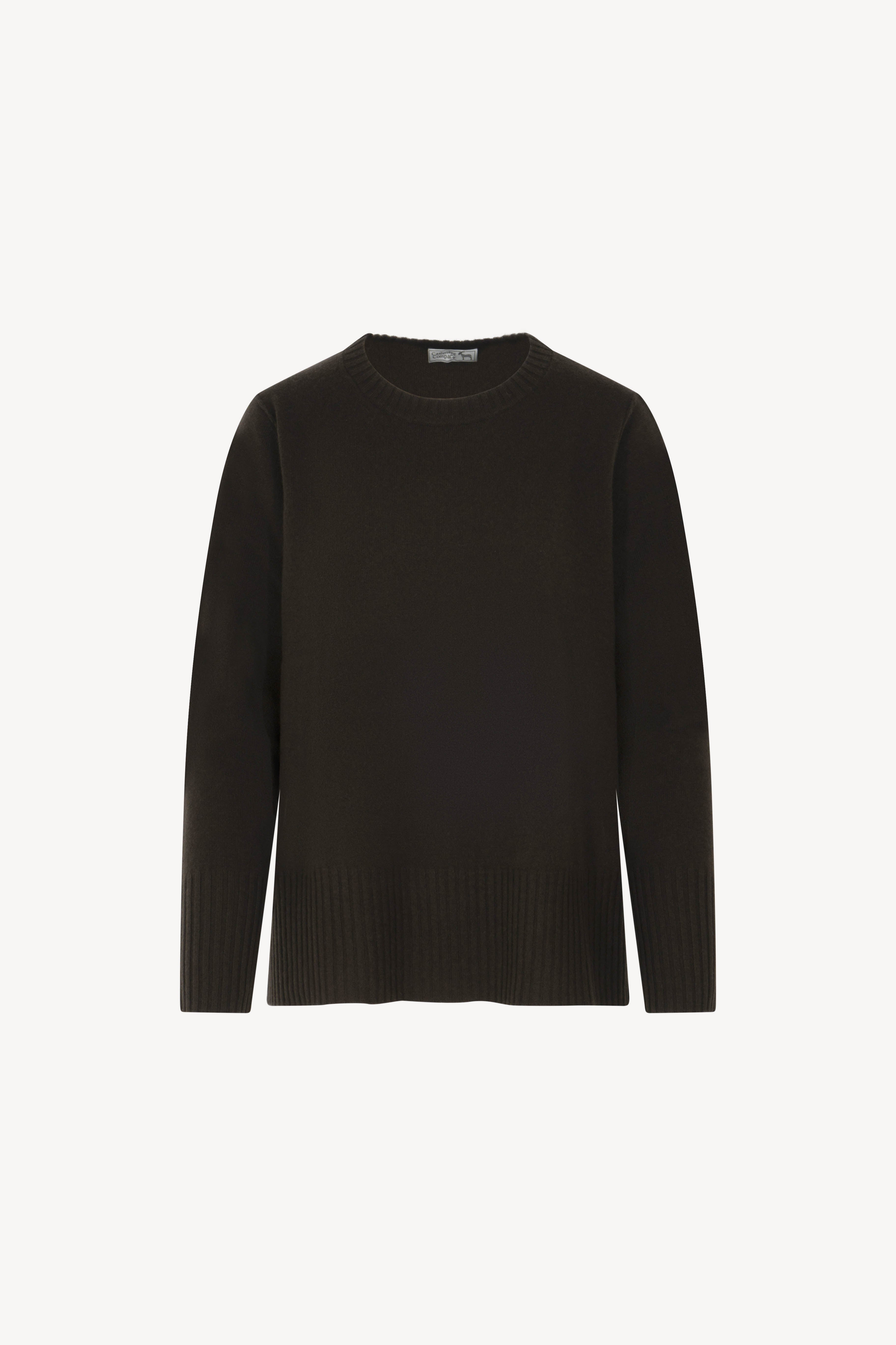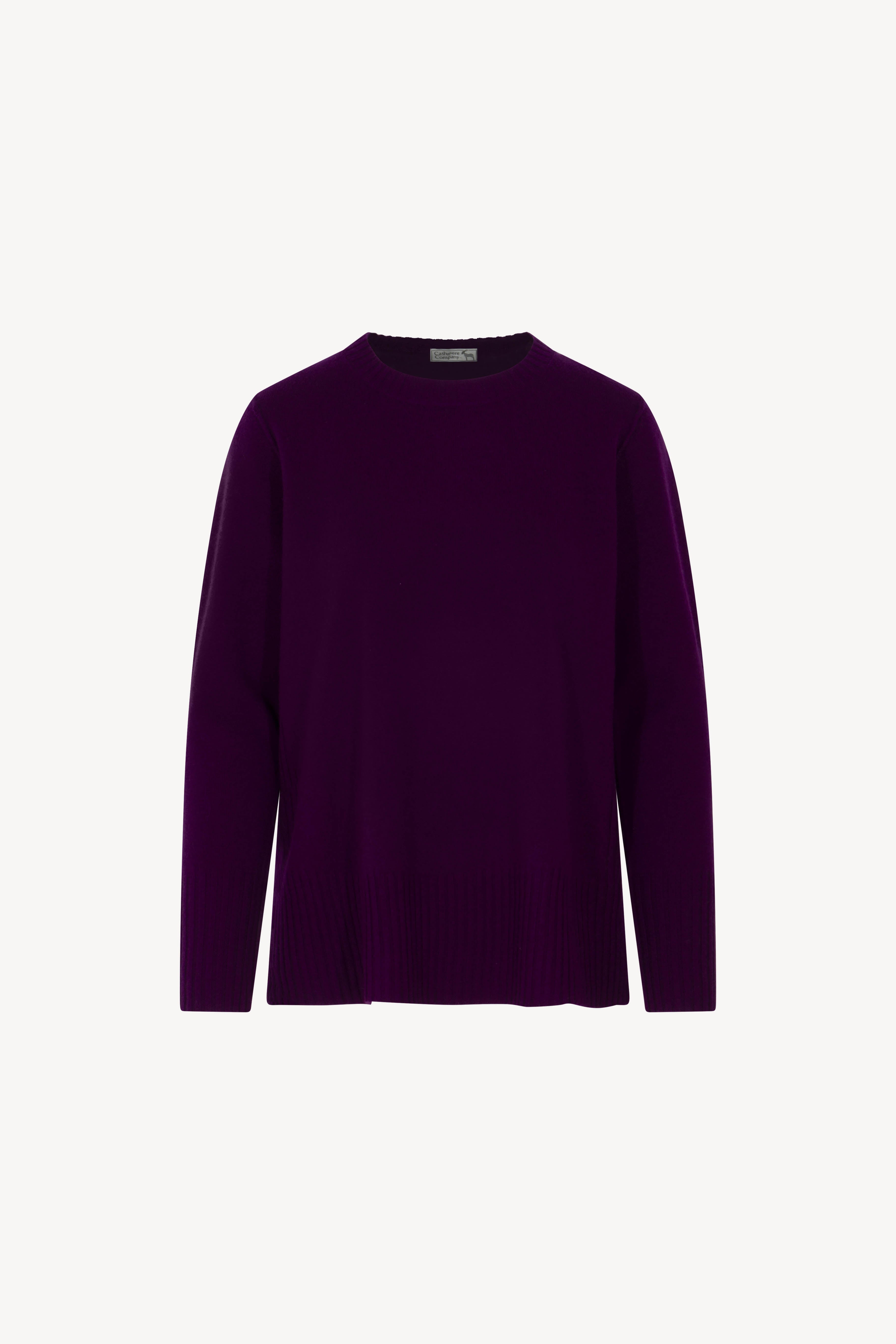 Maglia a girocollo con collo e fondi lavorati a coste e spacchi laterali. La vestibilità è morbida. Il capo è realizzato con filato 100% Cashmere 2/27 1 filo.