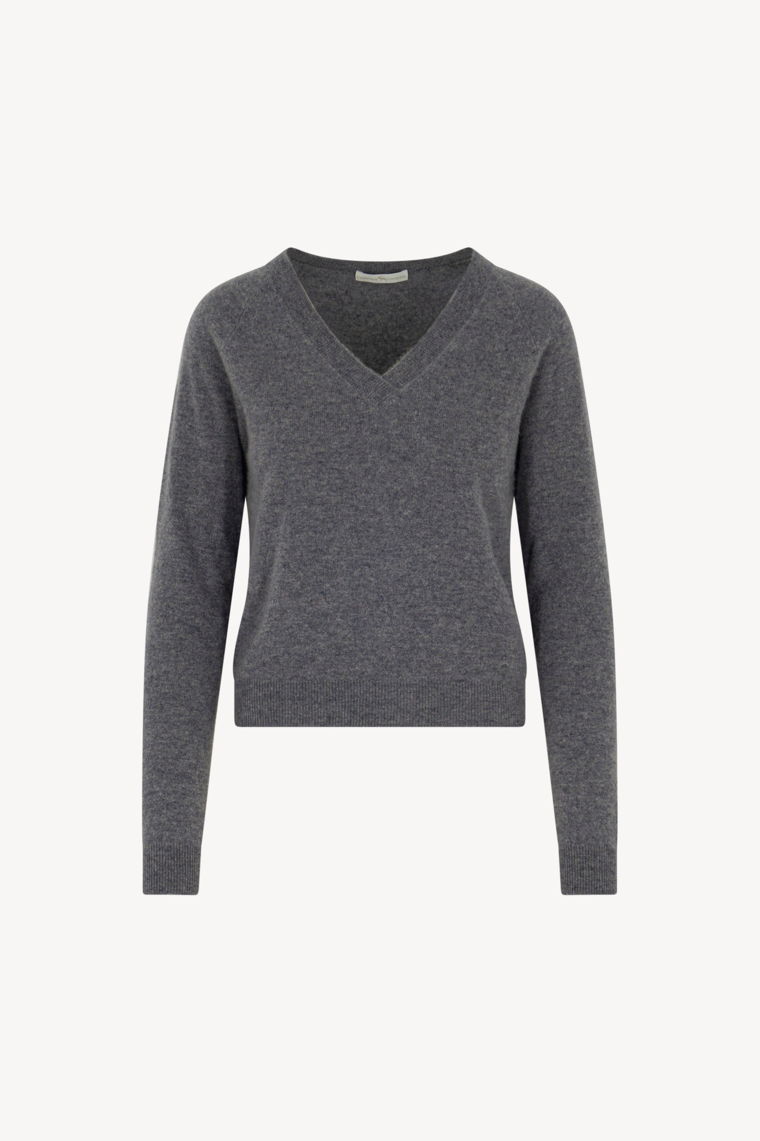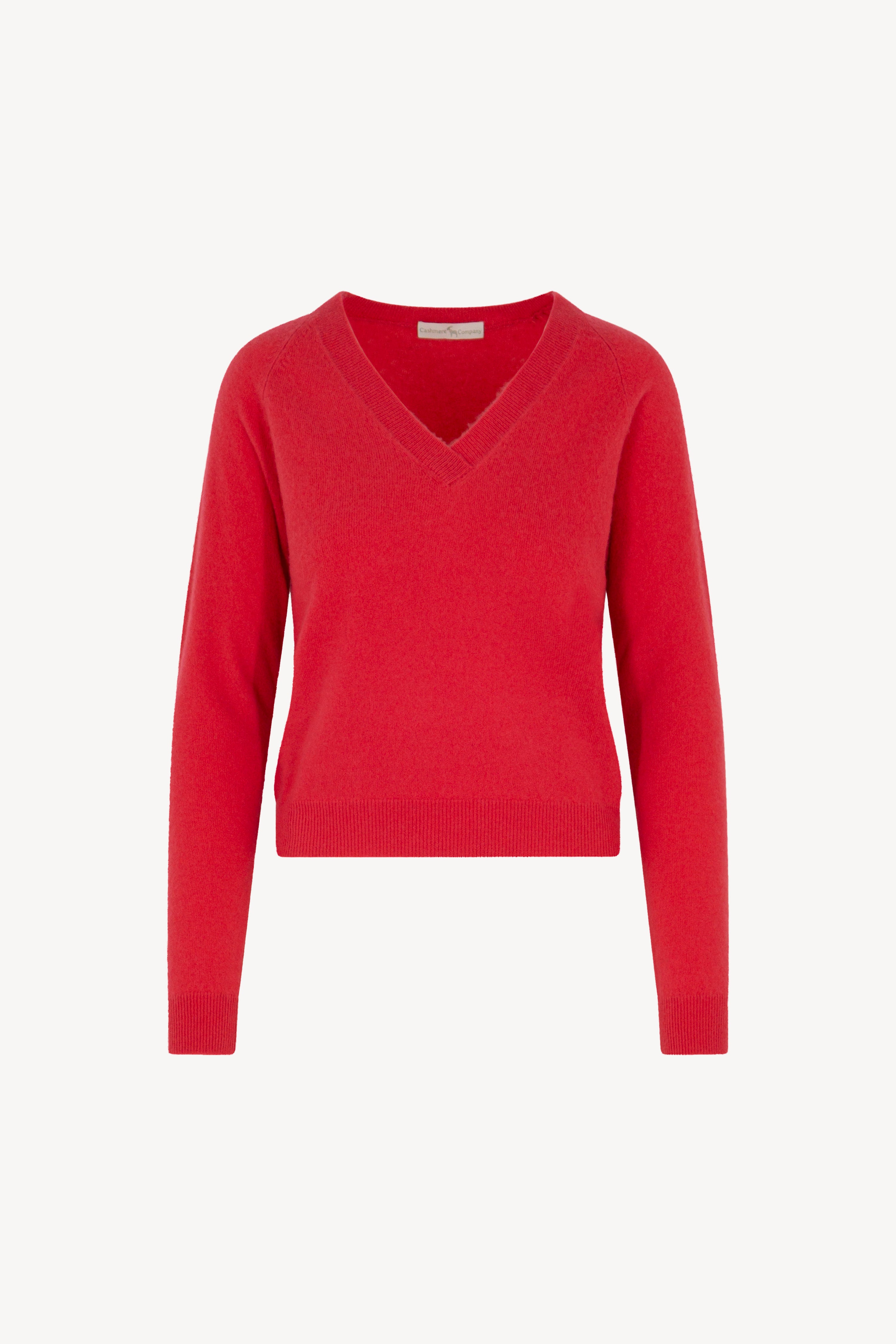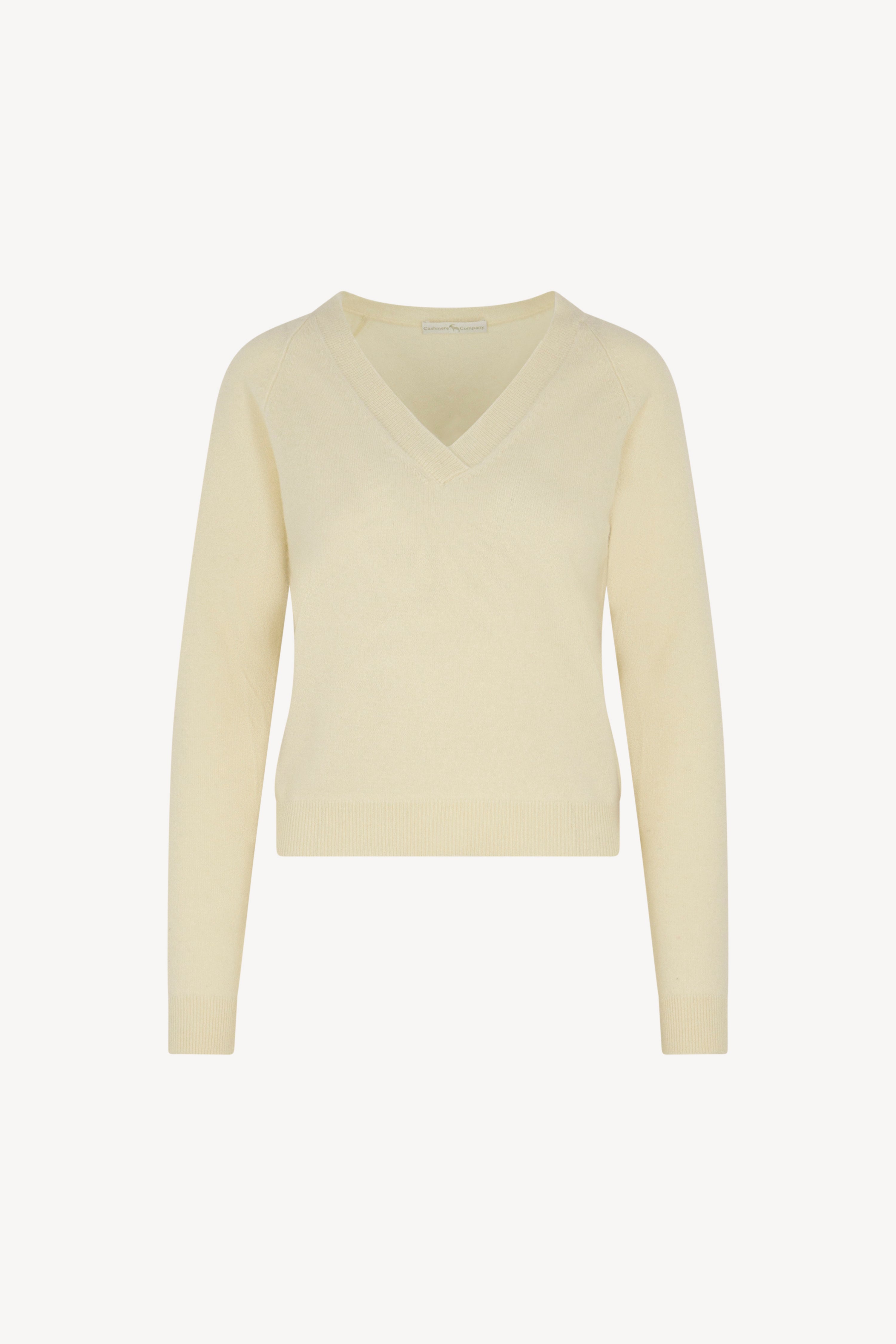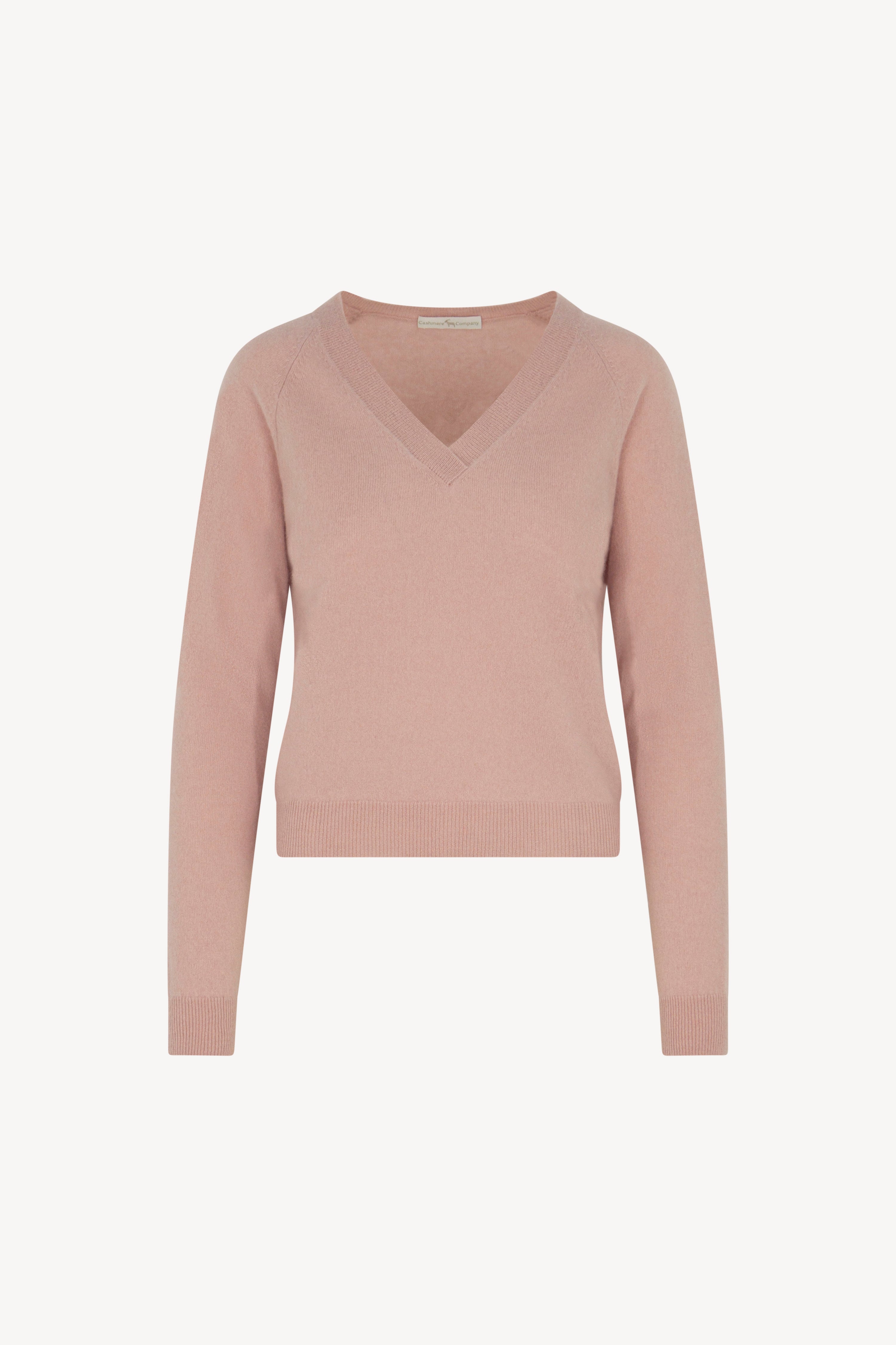 Maglia con scollo a V con manica raglan con collo e fondi lavorati a coste. Vestibilità regolare. Il capo è realizzato con filato 100% Cashmere 2/27 1 filo.