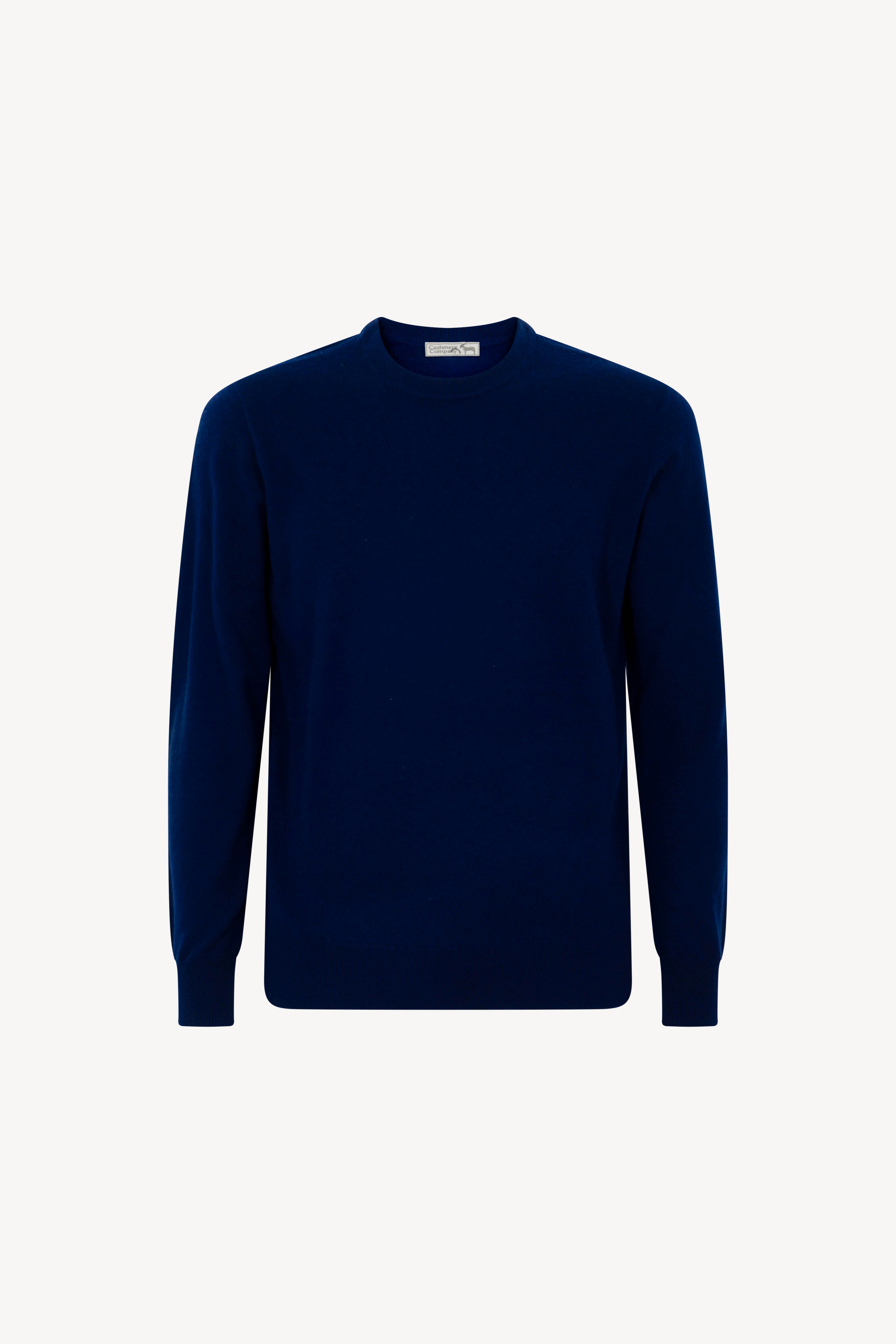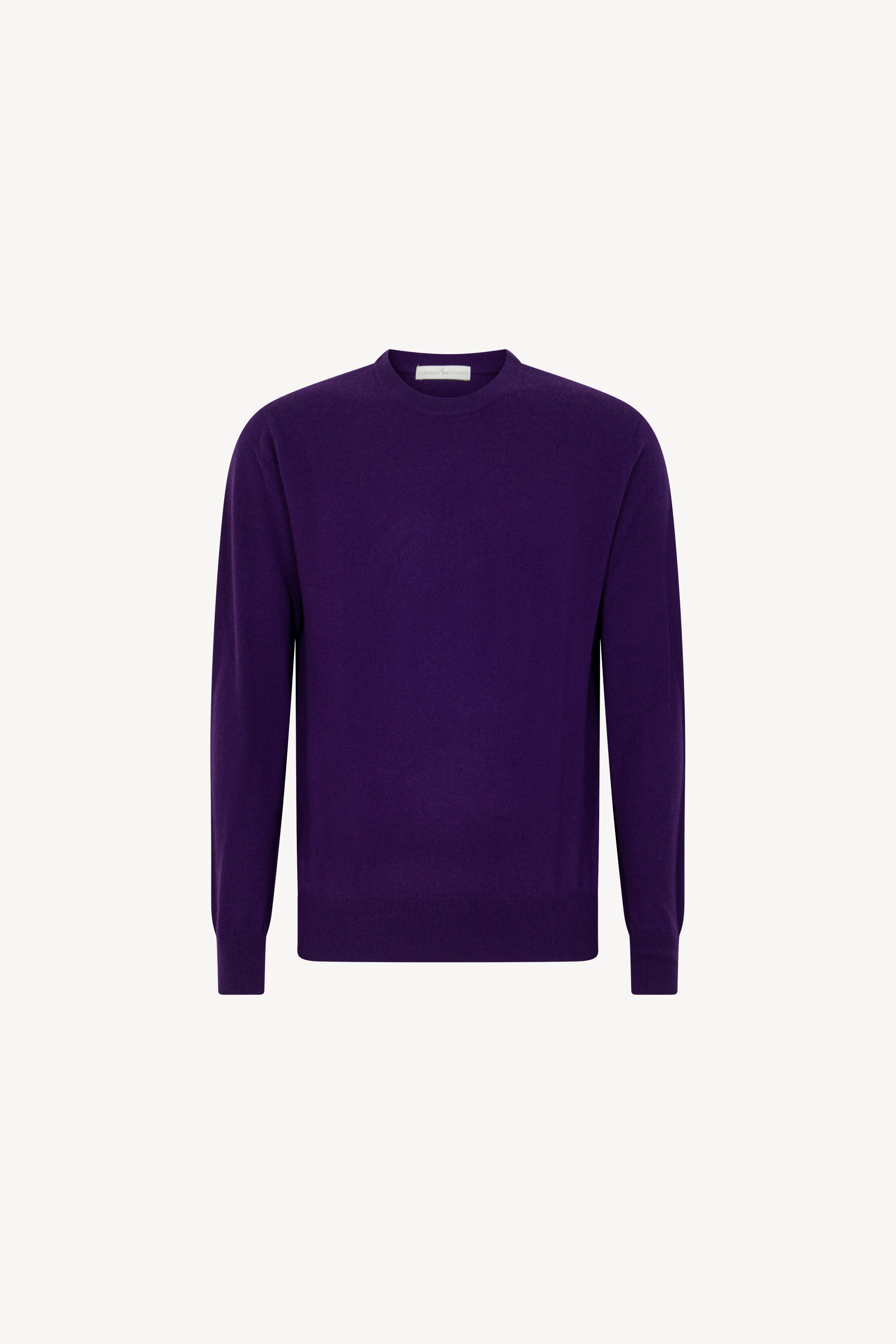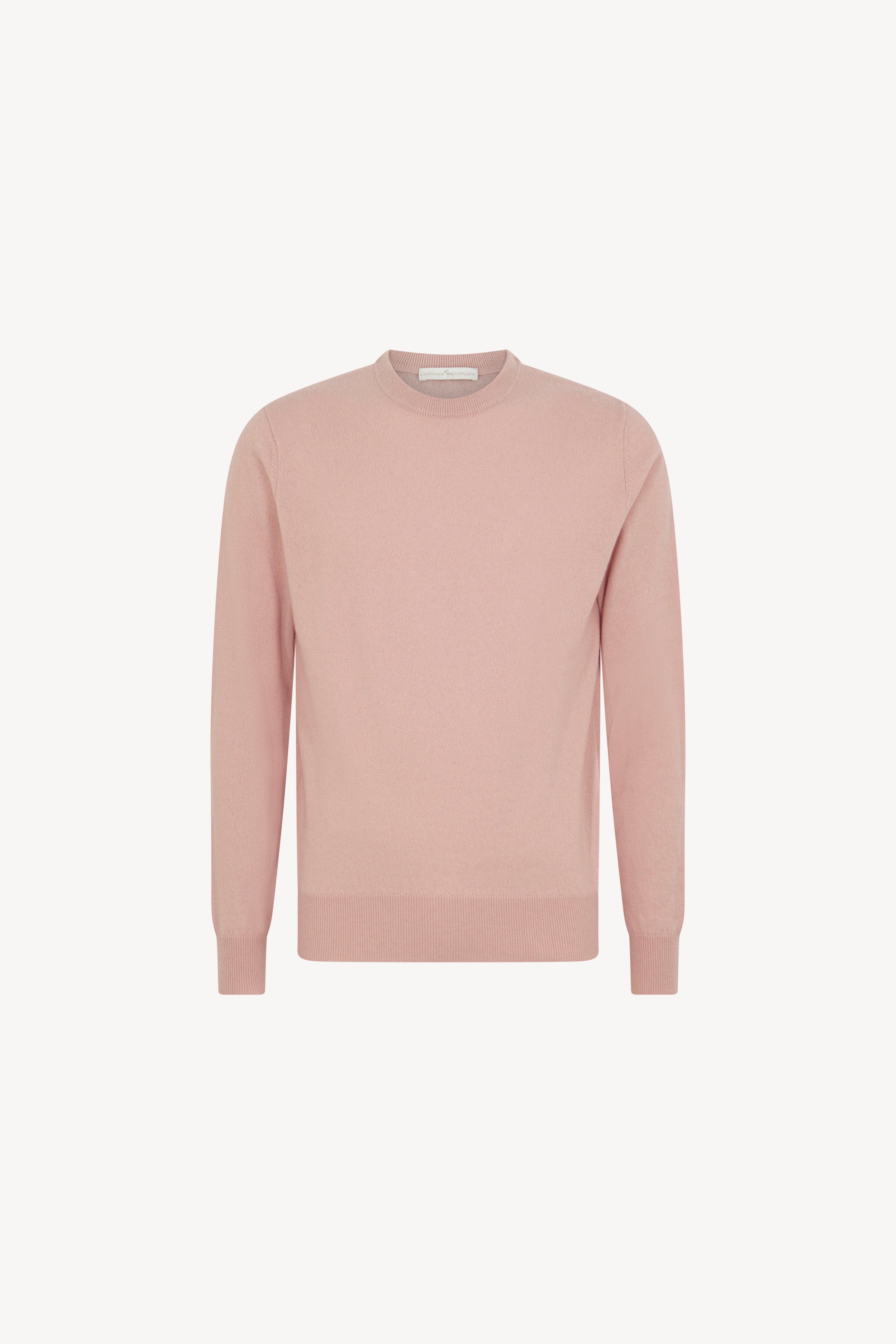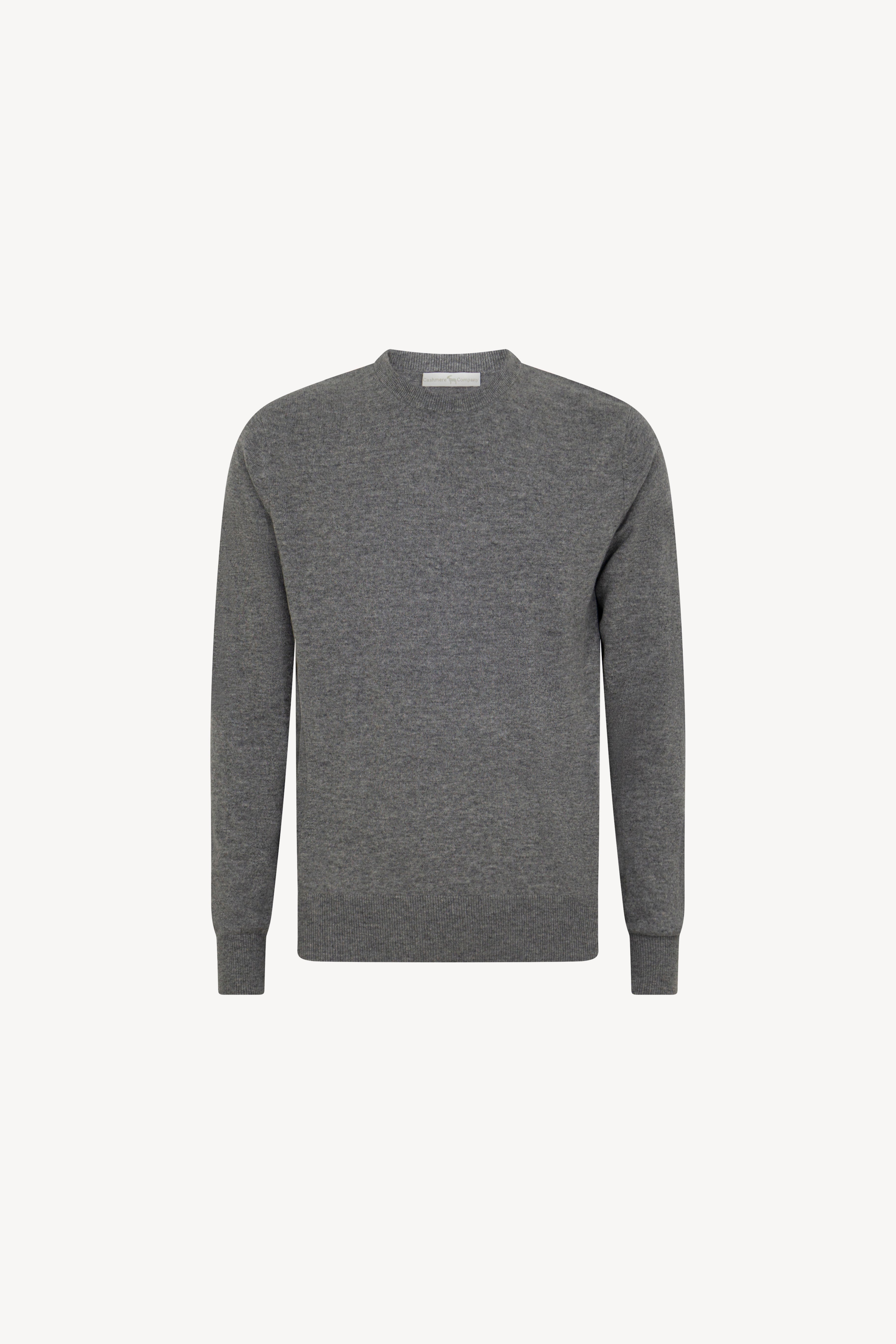 Pull girocollo in maglia rasata con collo e profili lavorati a costine. La vestibilità è regolare. Il capo è realizzato con filato 100% Cashmere 2/27 1 filo.