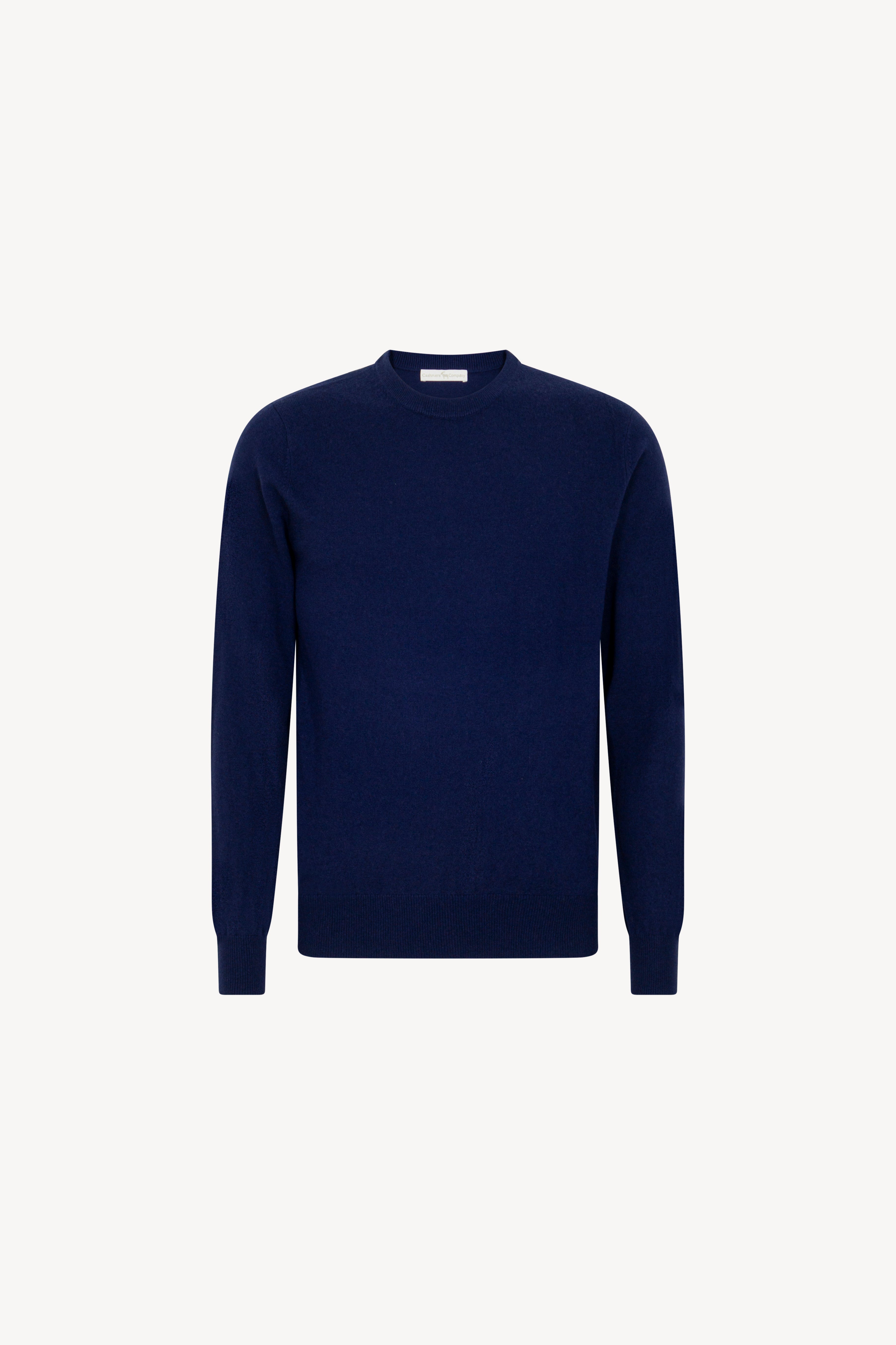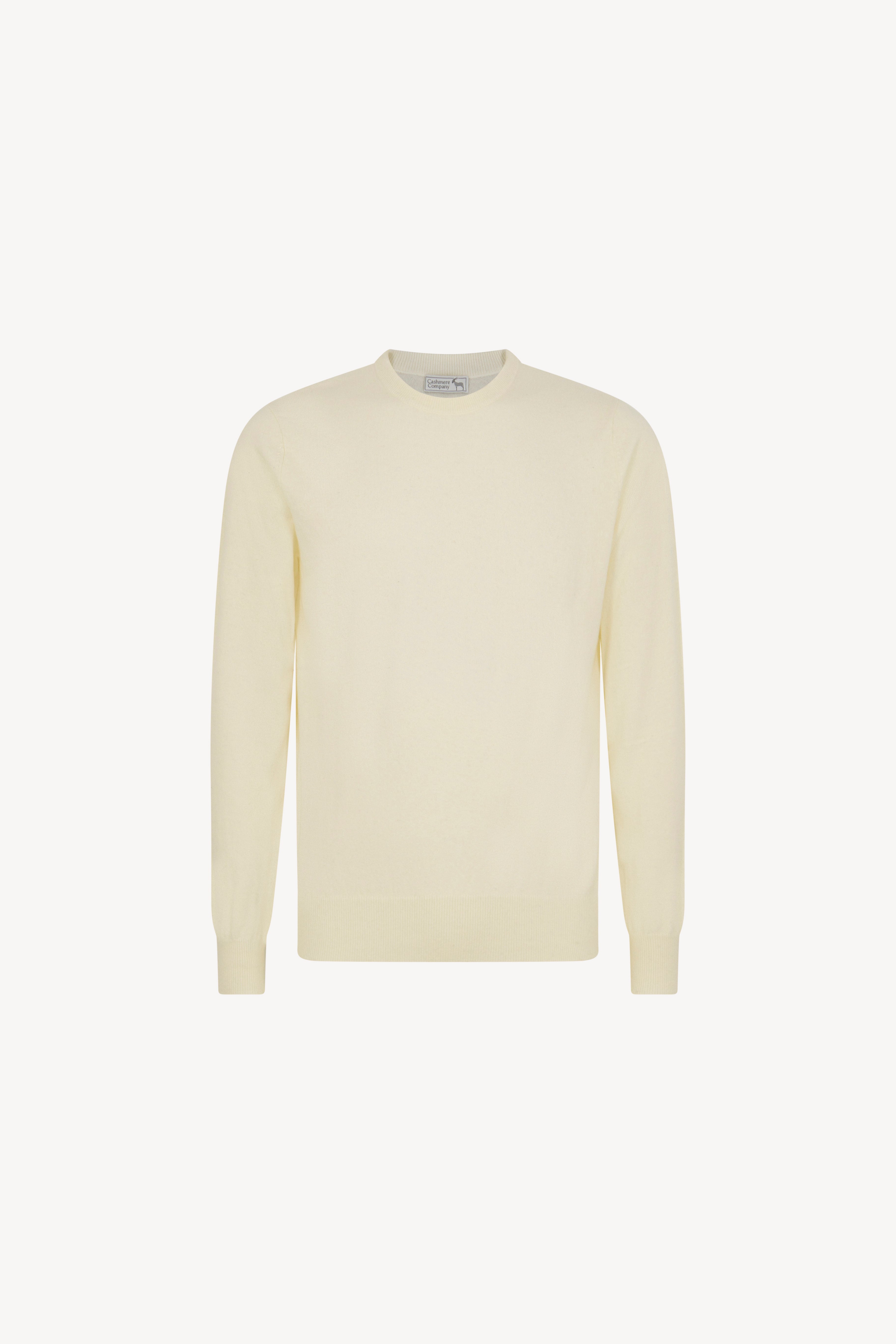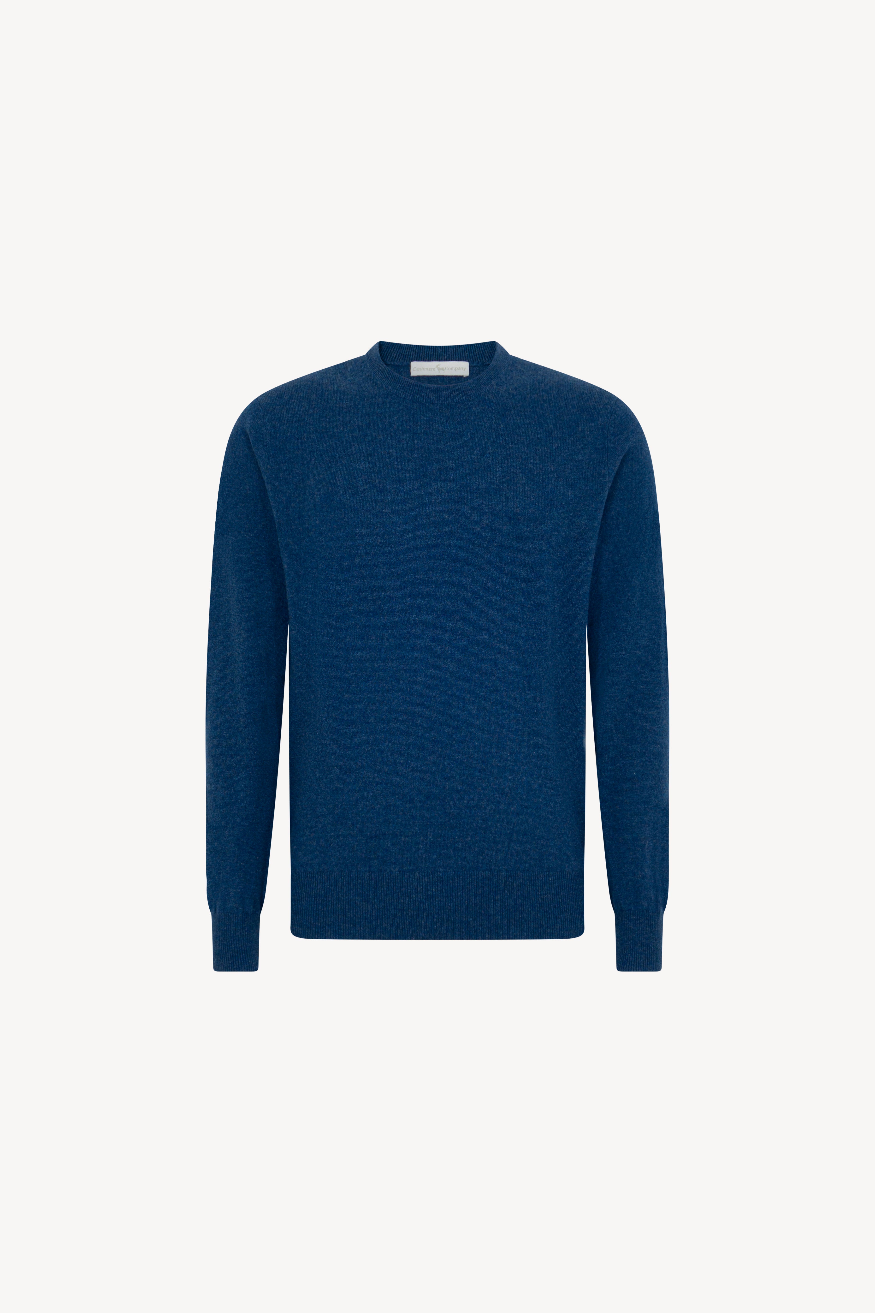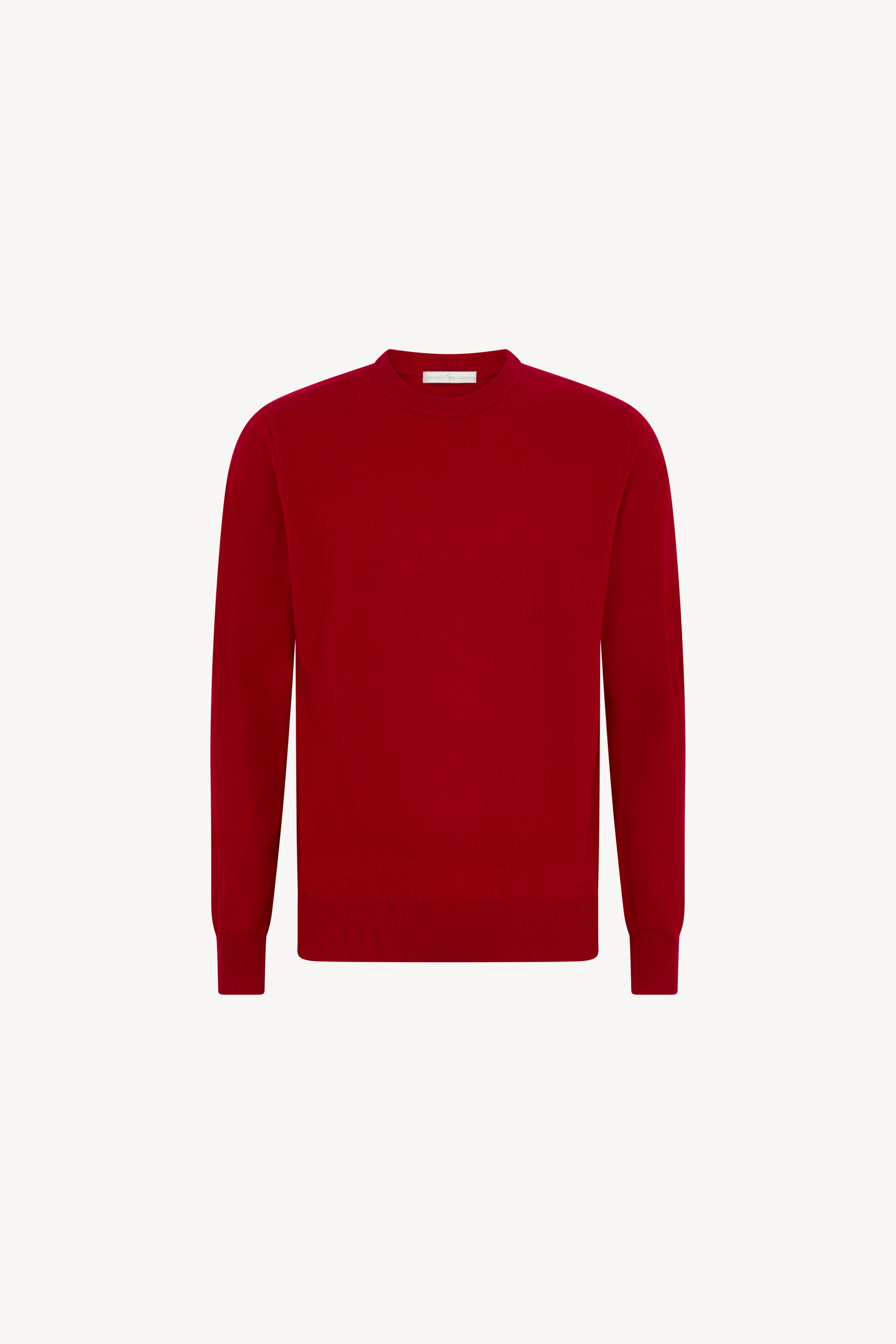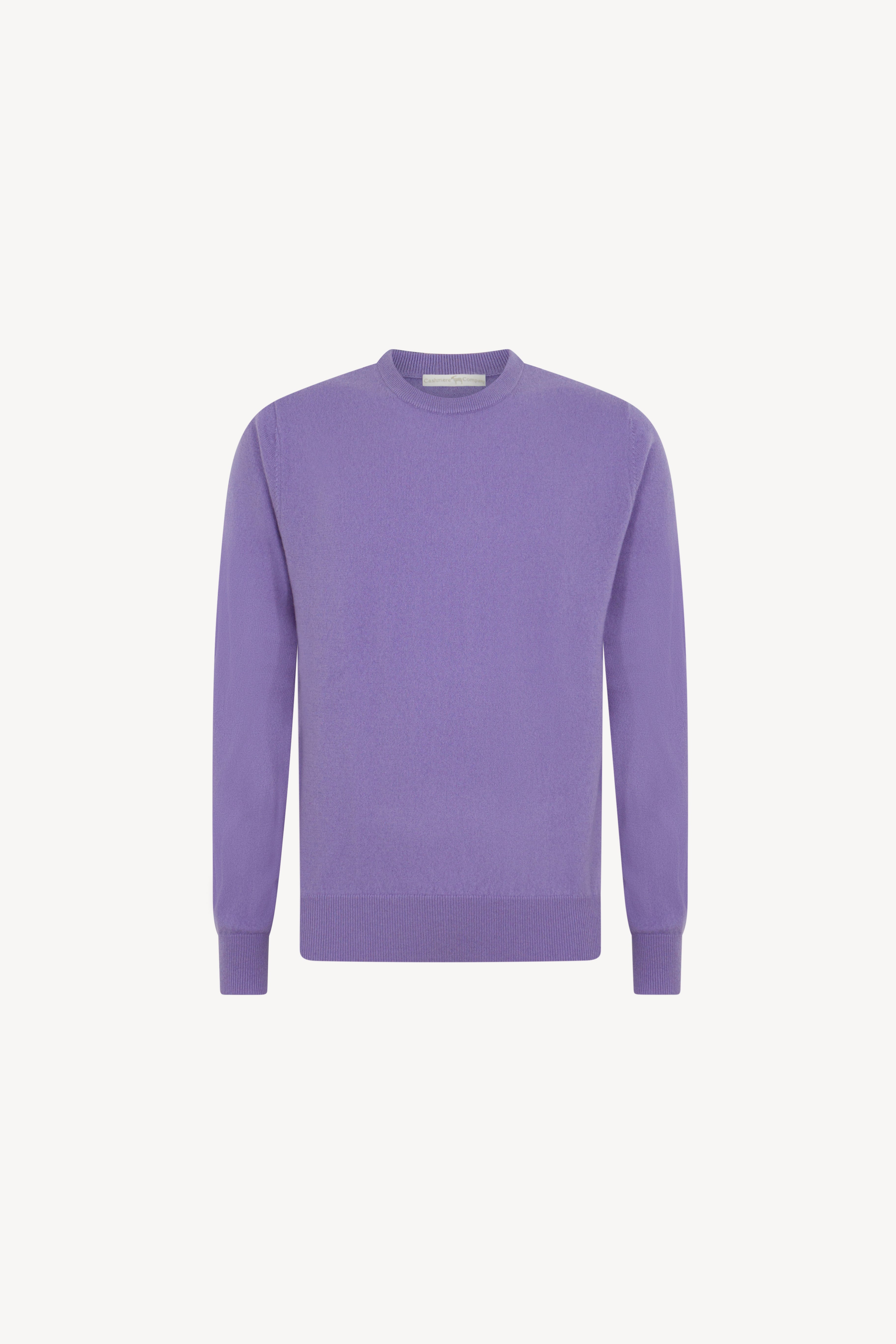 Pull girocollo in maglia rasata con collo e profili lavorati a costine. La vestibilità è regolare. Il capo è realizzato con filato 100% Cashmere 2/27 1 filo.