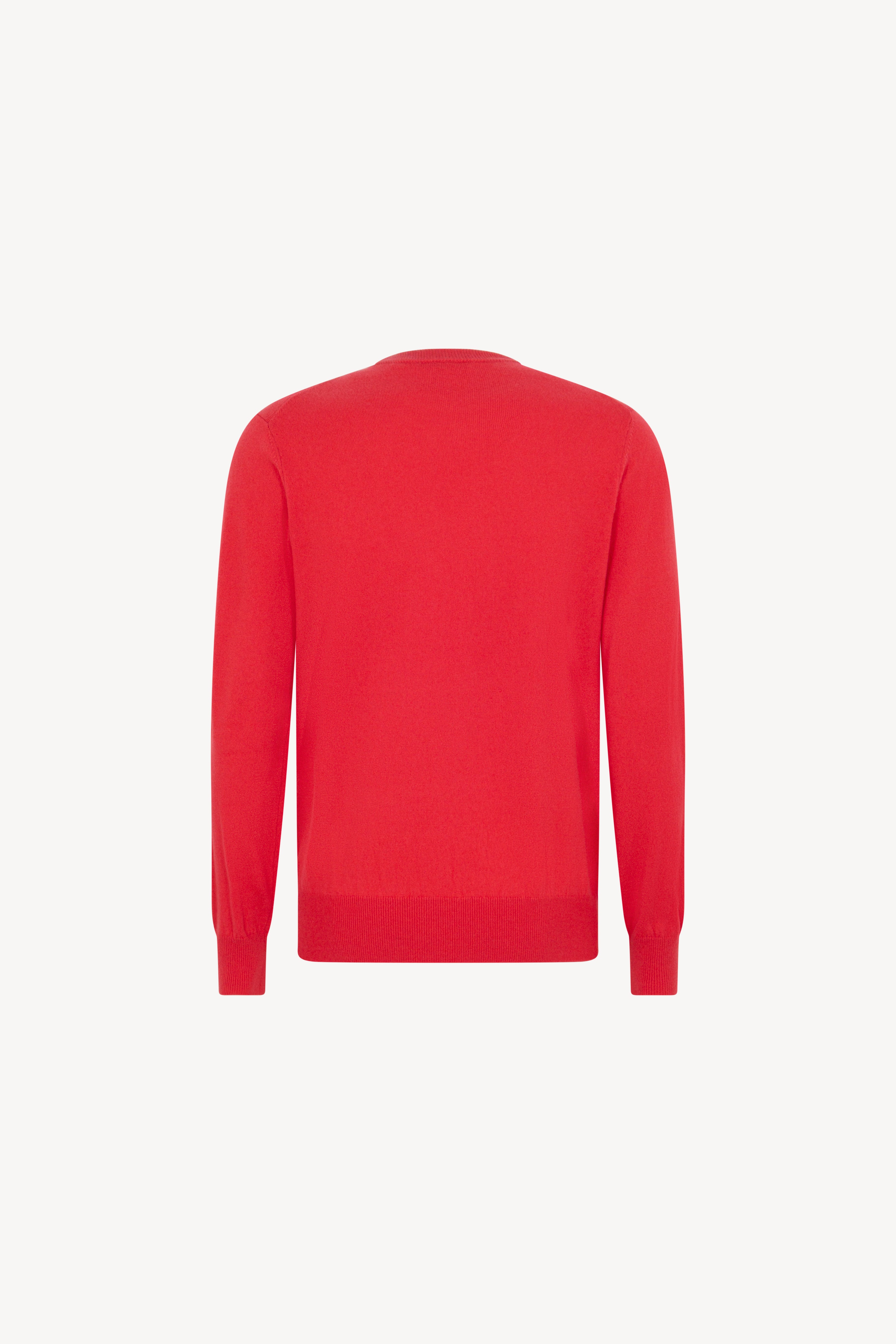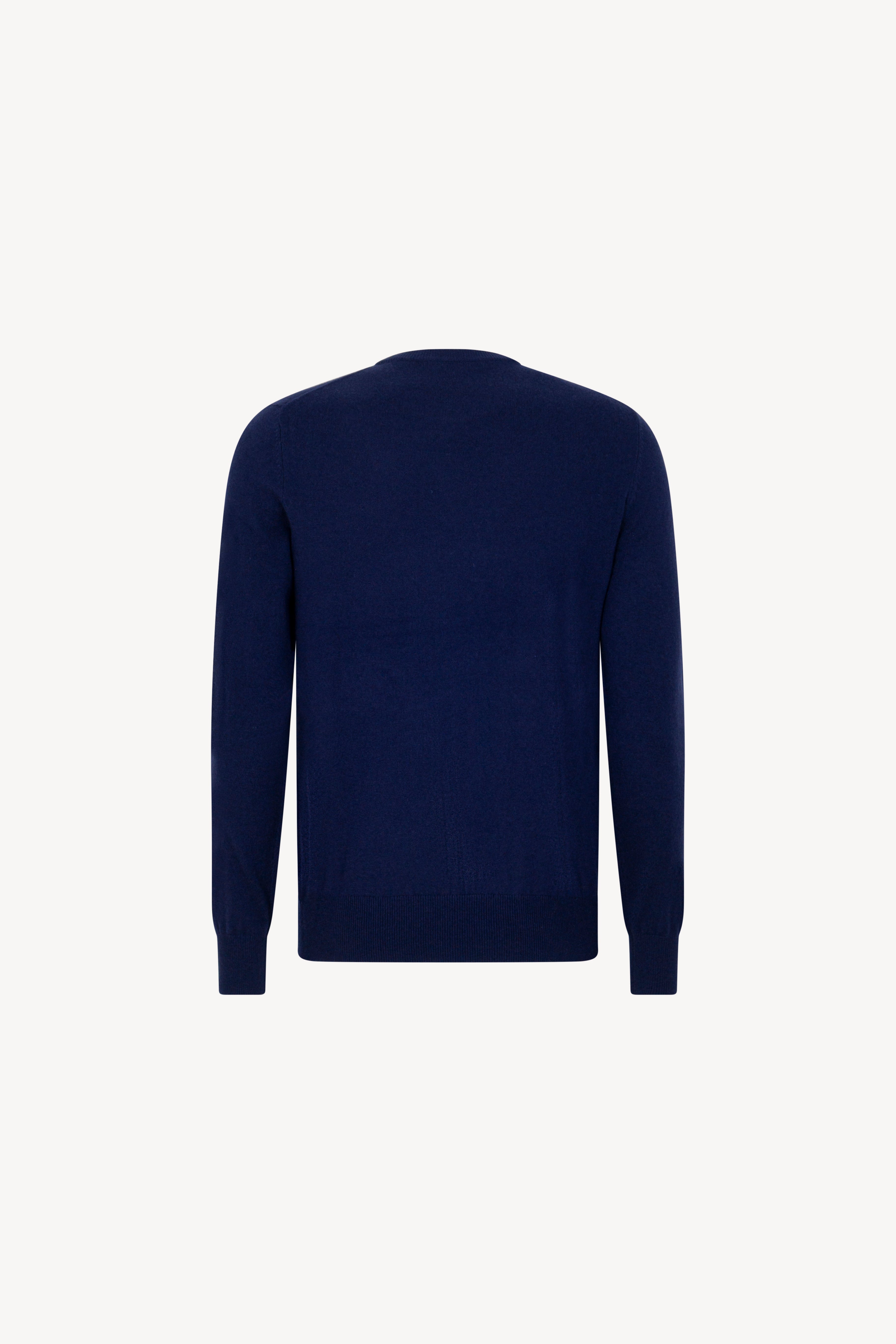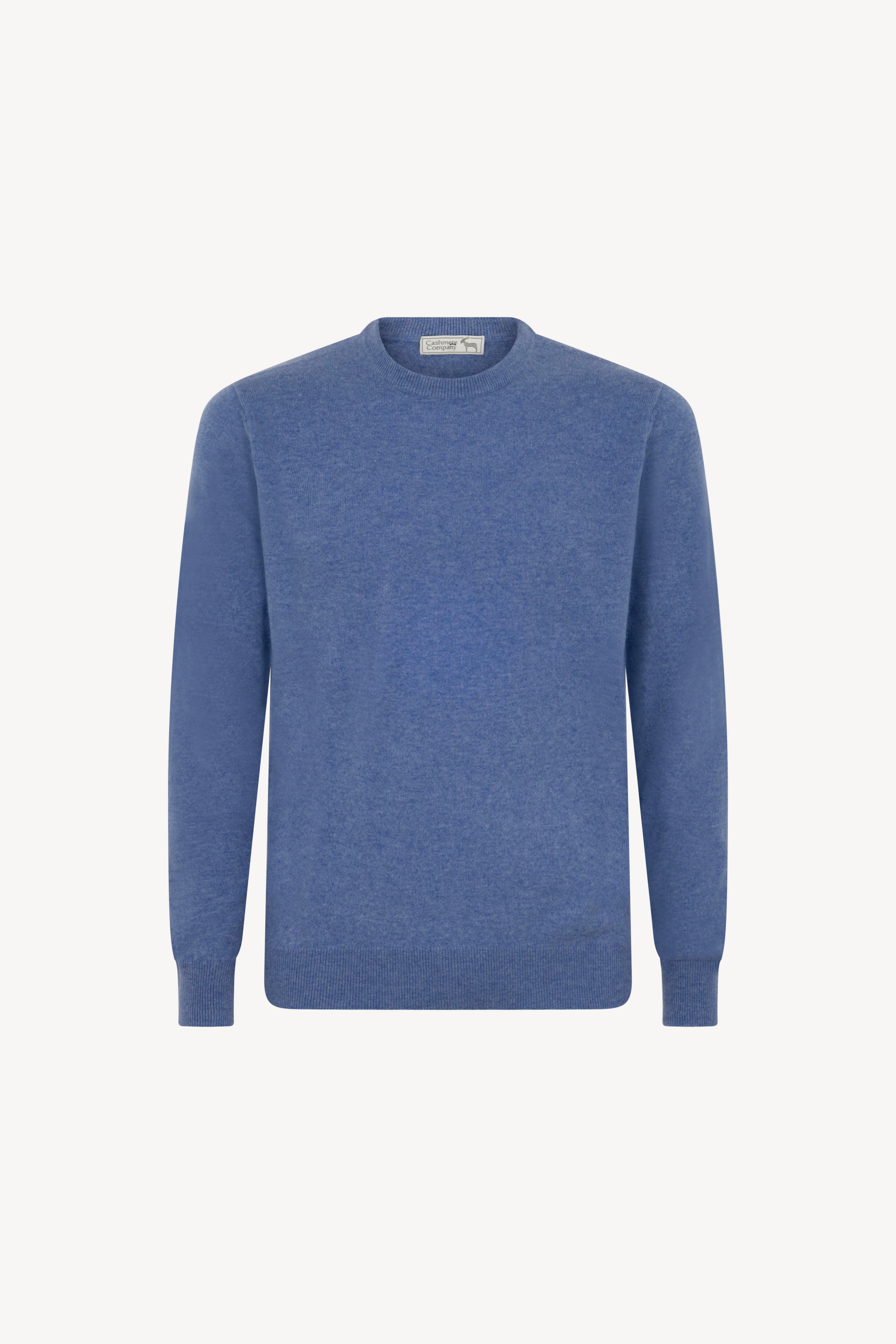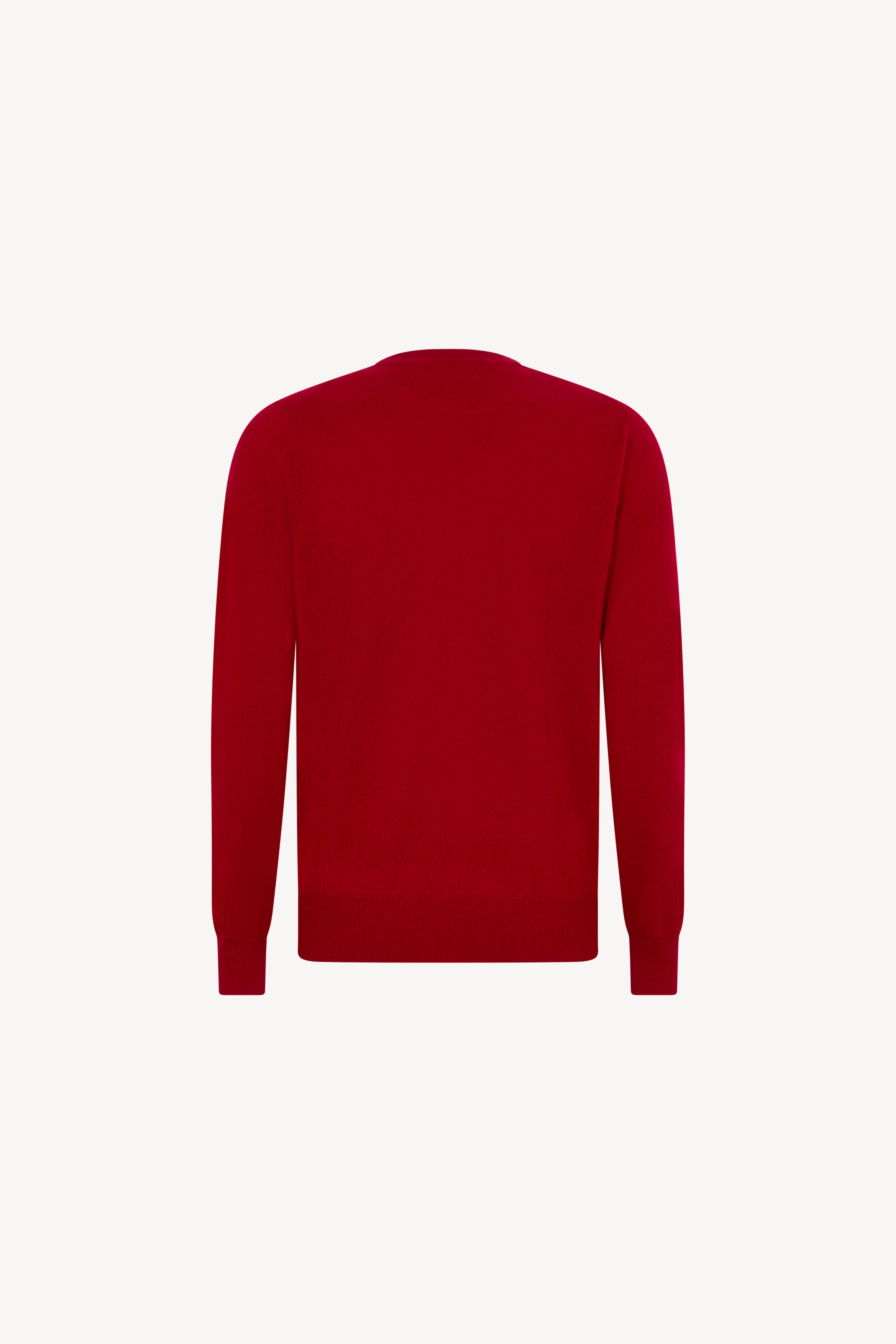Pull girocollo in maglia rasata con collo e profili lavorati a costine. La vestibilità è regolare. Il capo è realizzato con filato 100% Cashmere 2/27 1 filo.