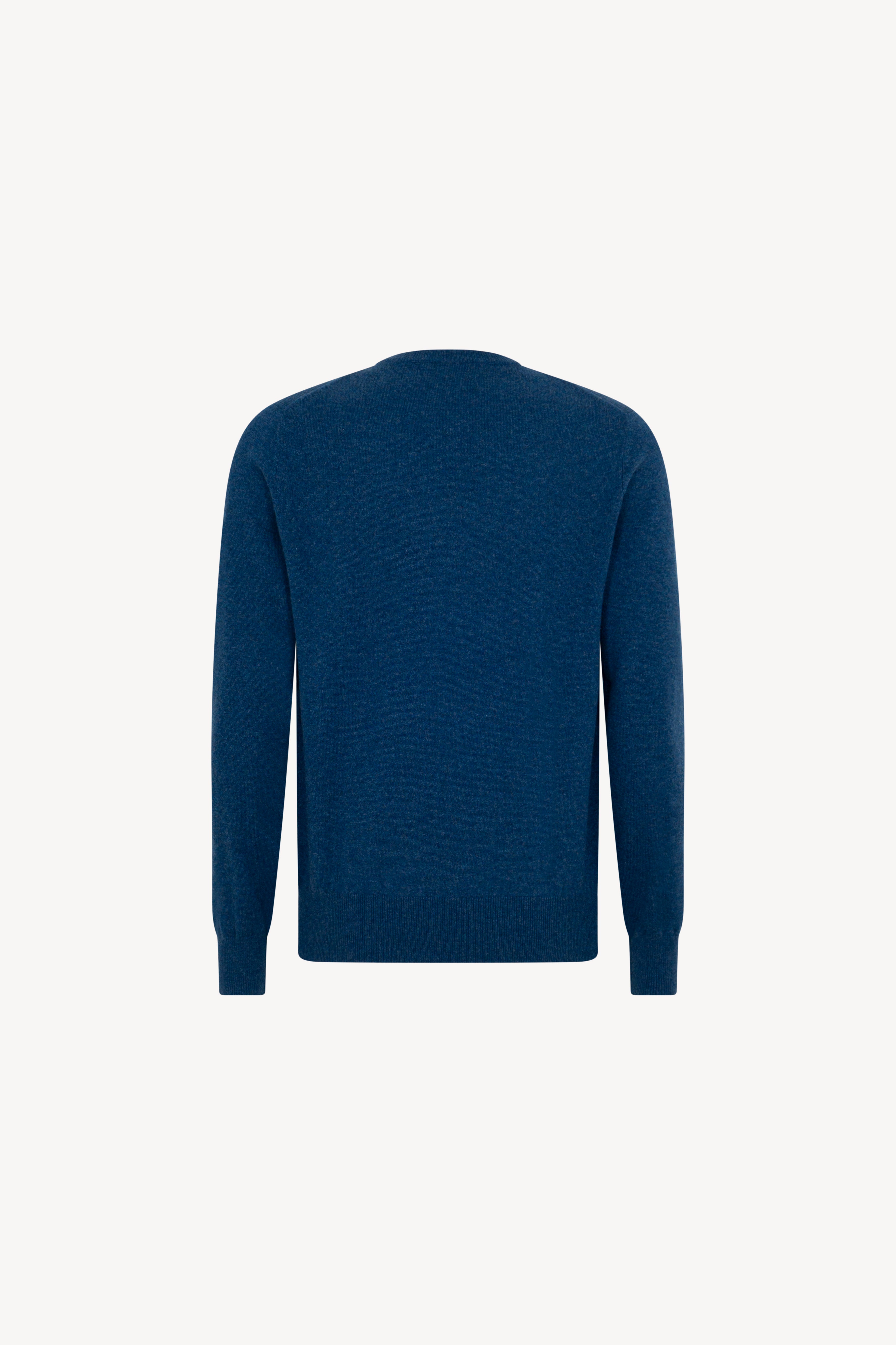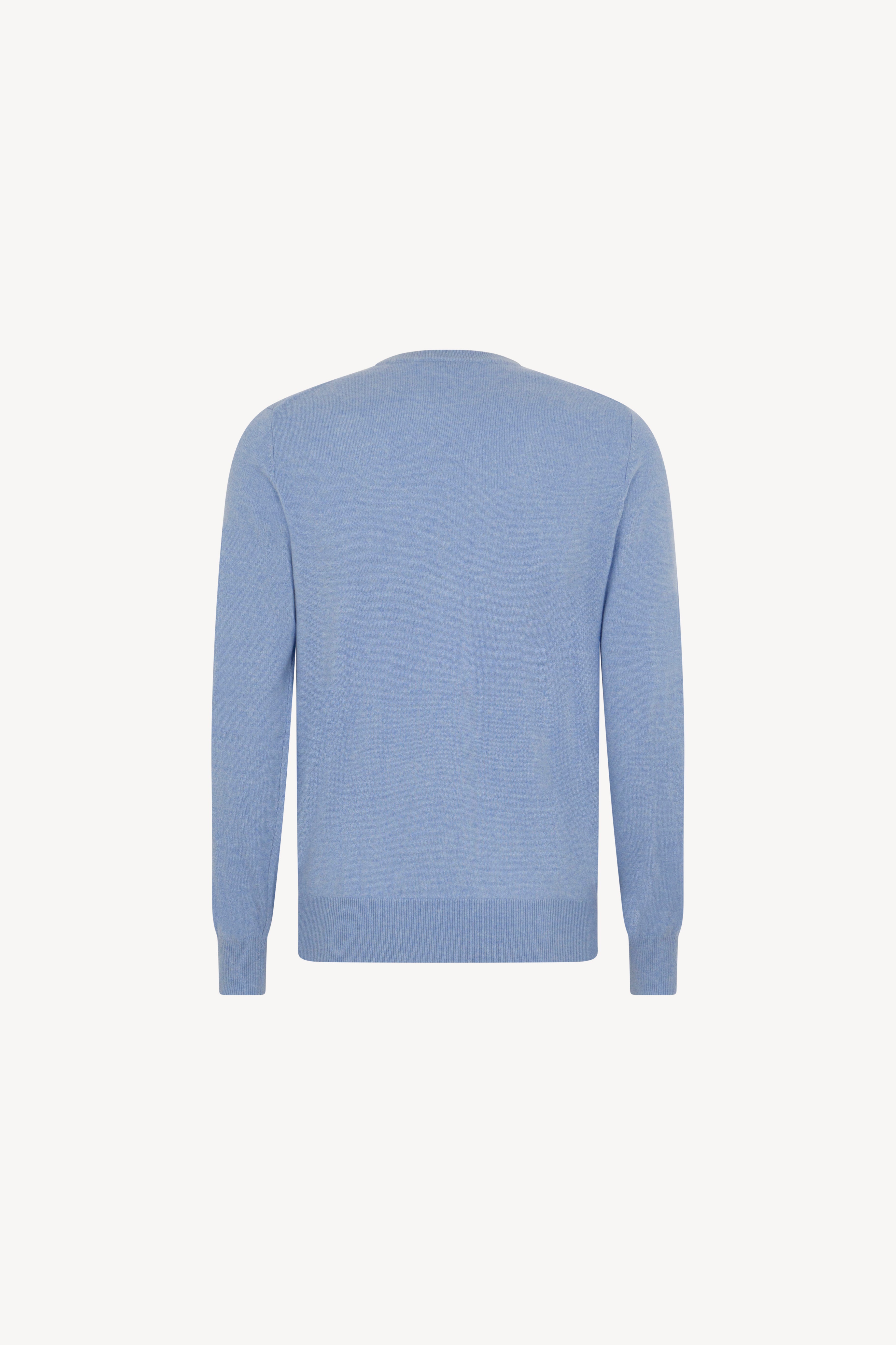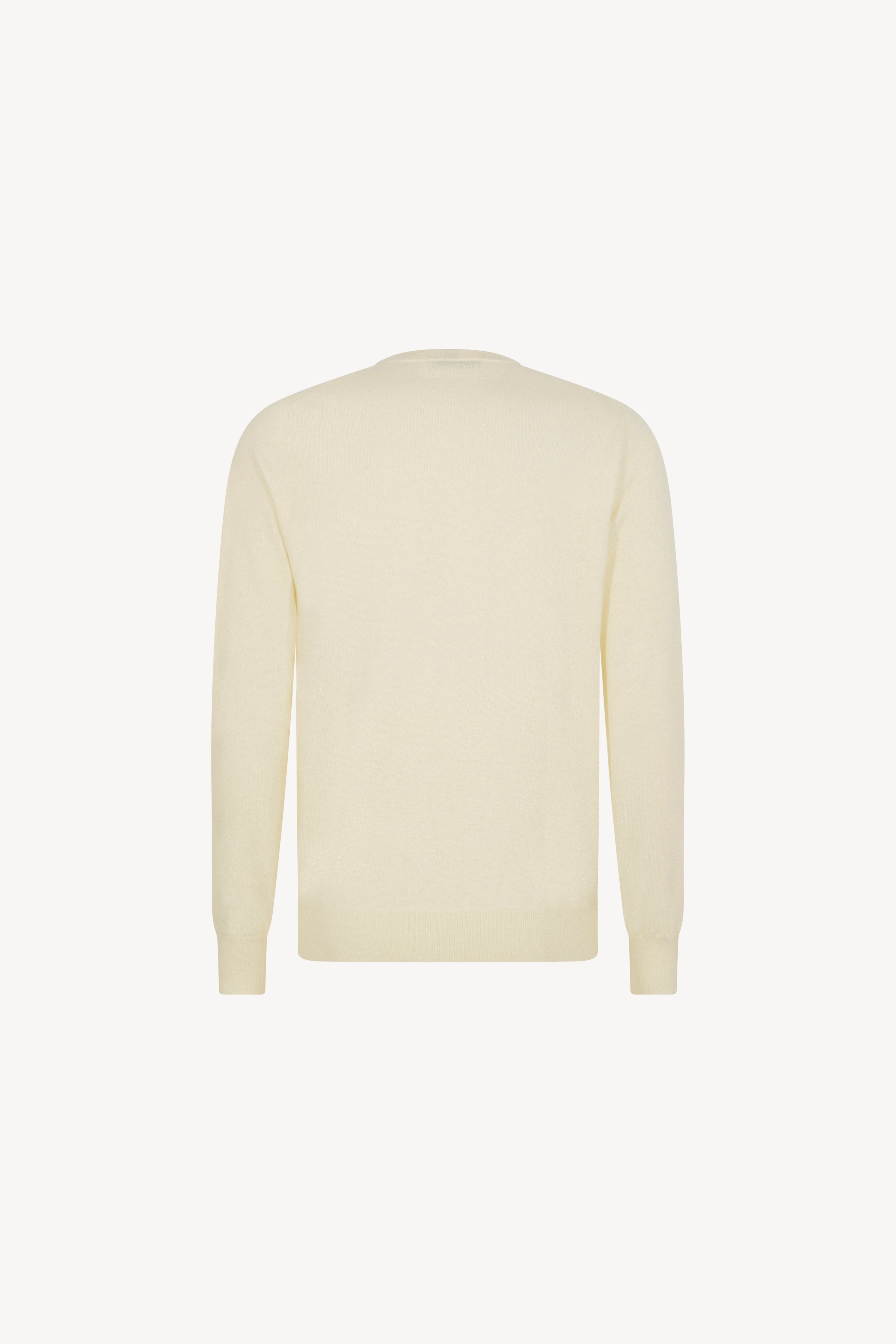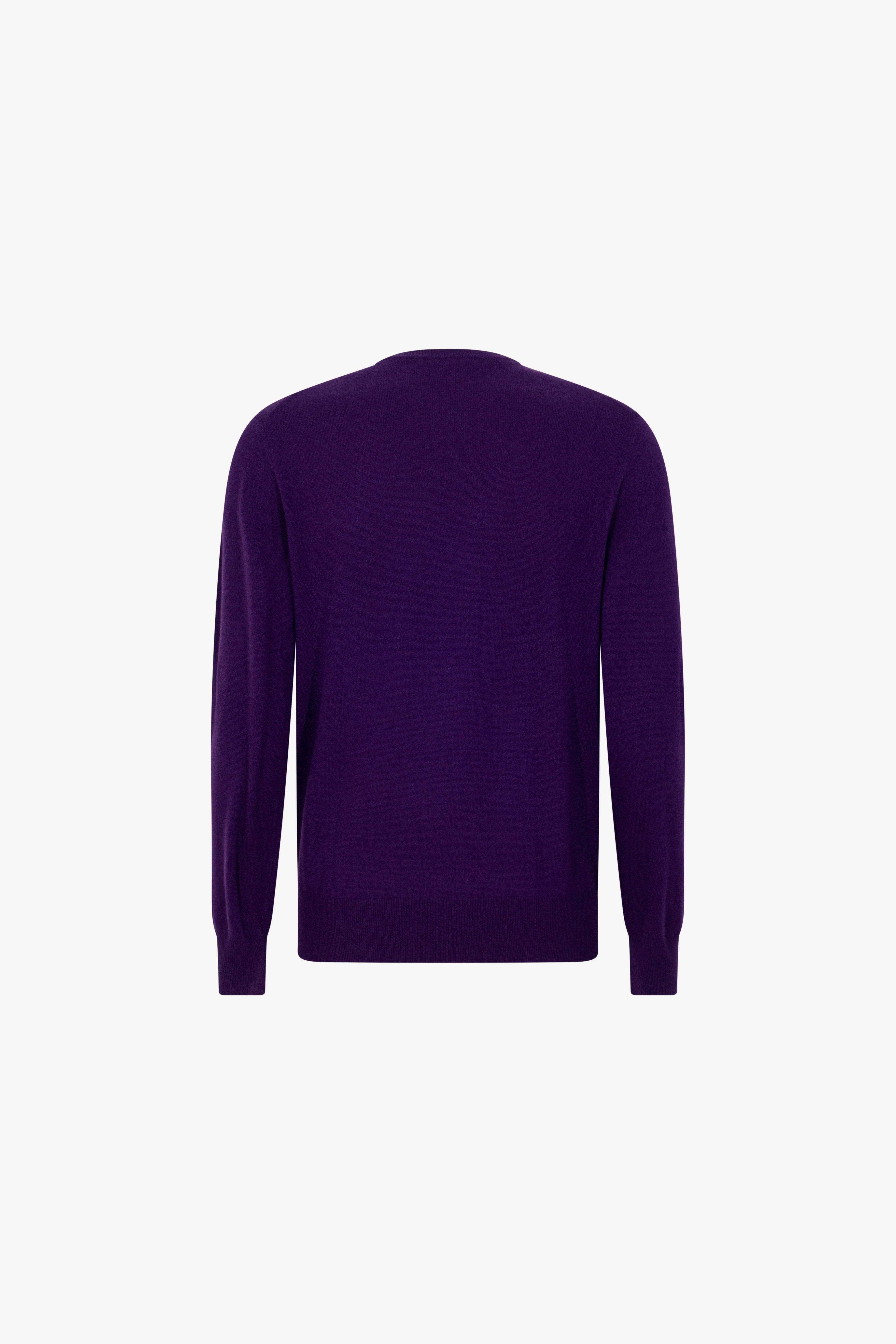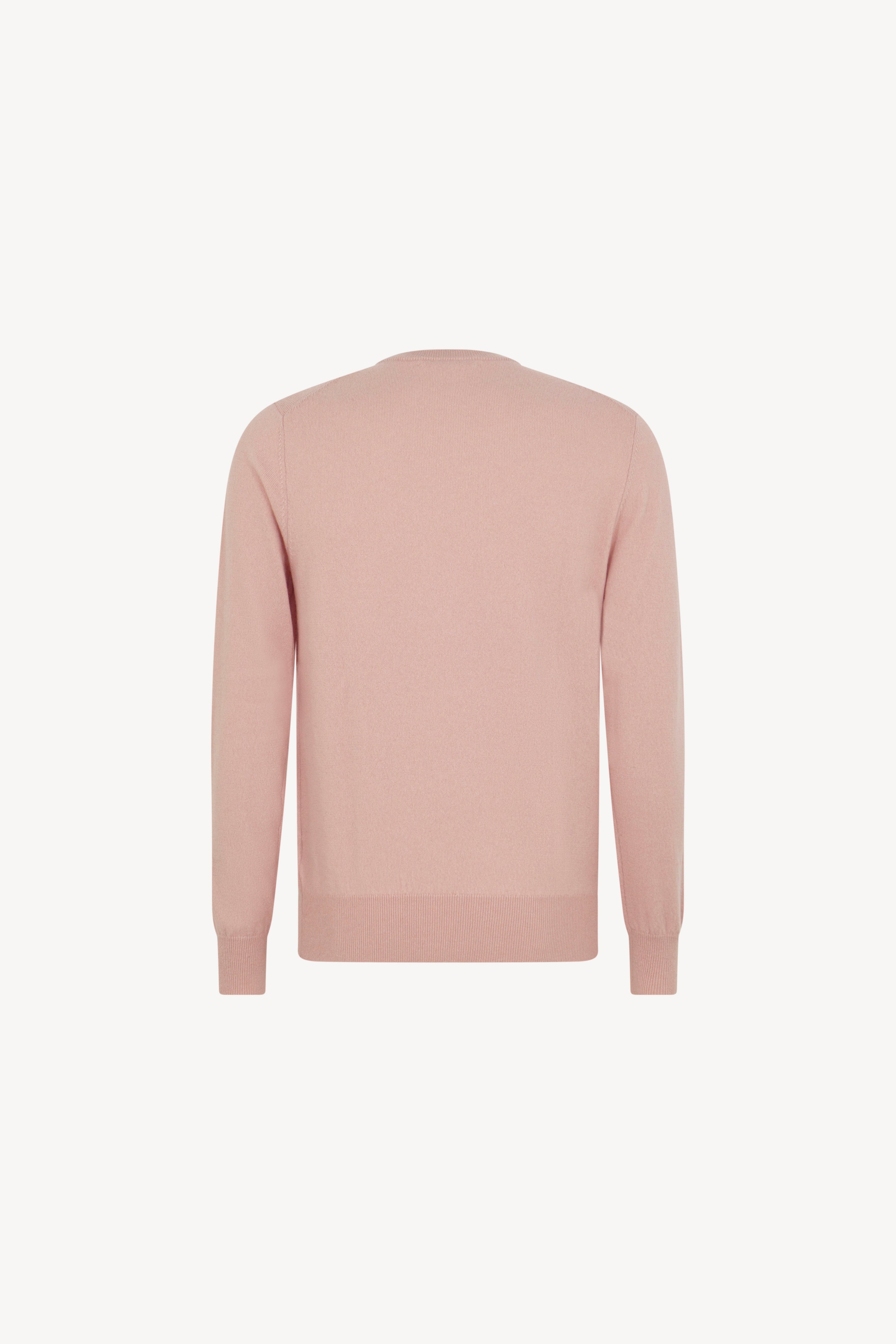 Pull girocollo in maglia rasata con collo e profili lavorati a costine. La vestibilità è regolare. Il capo è realizzato con filato 100% Cashmere 2/27 1 filo.