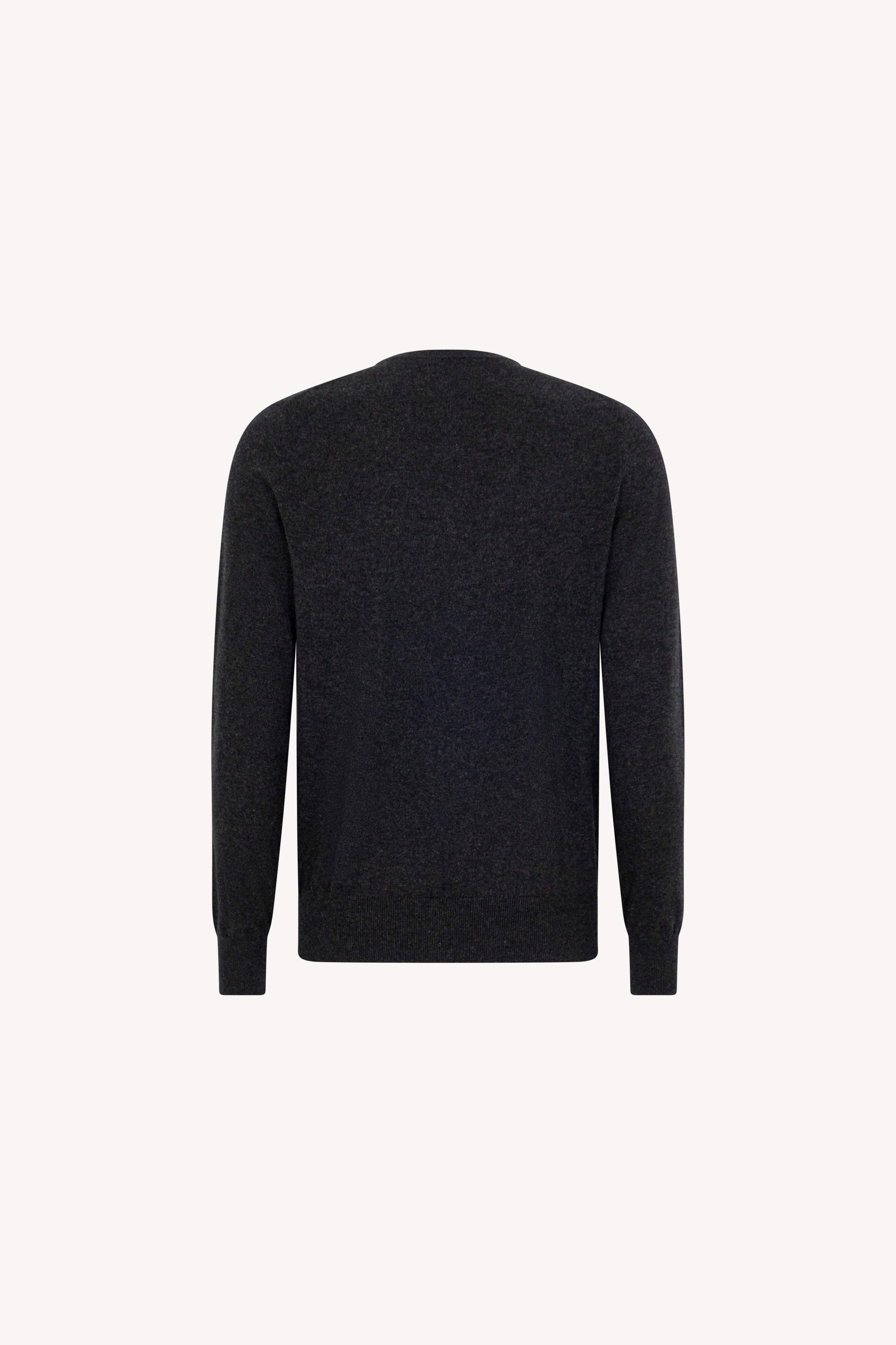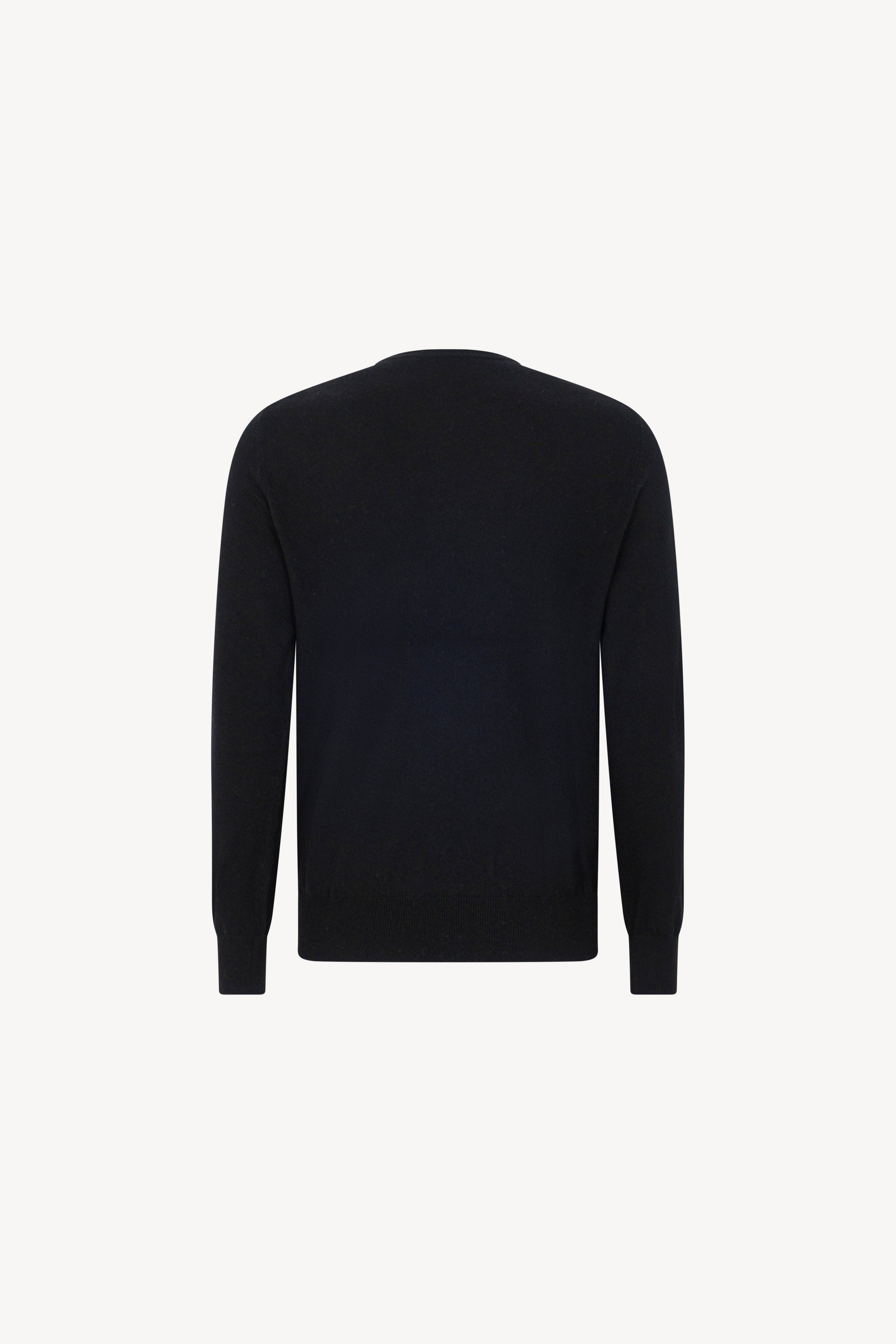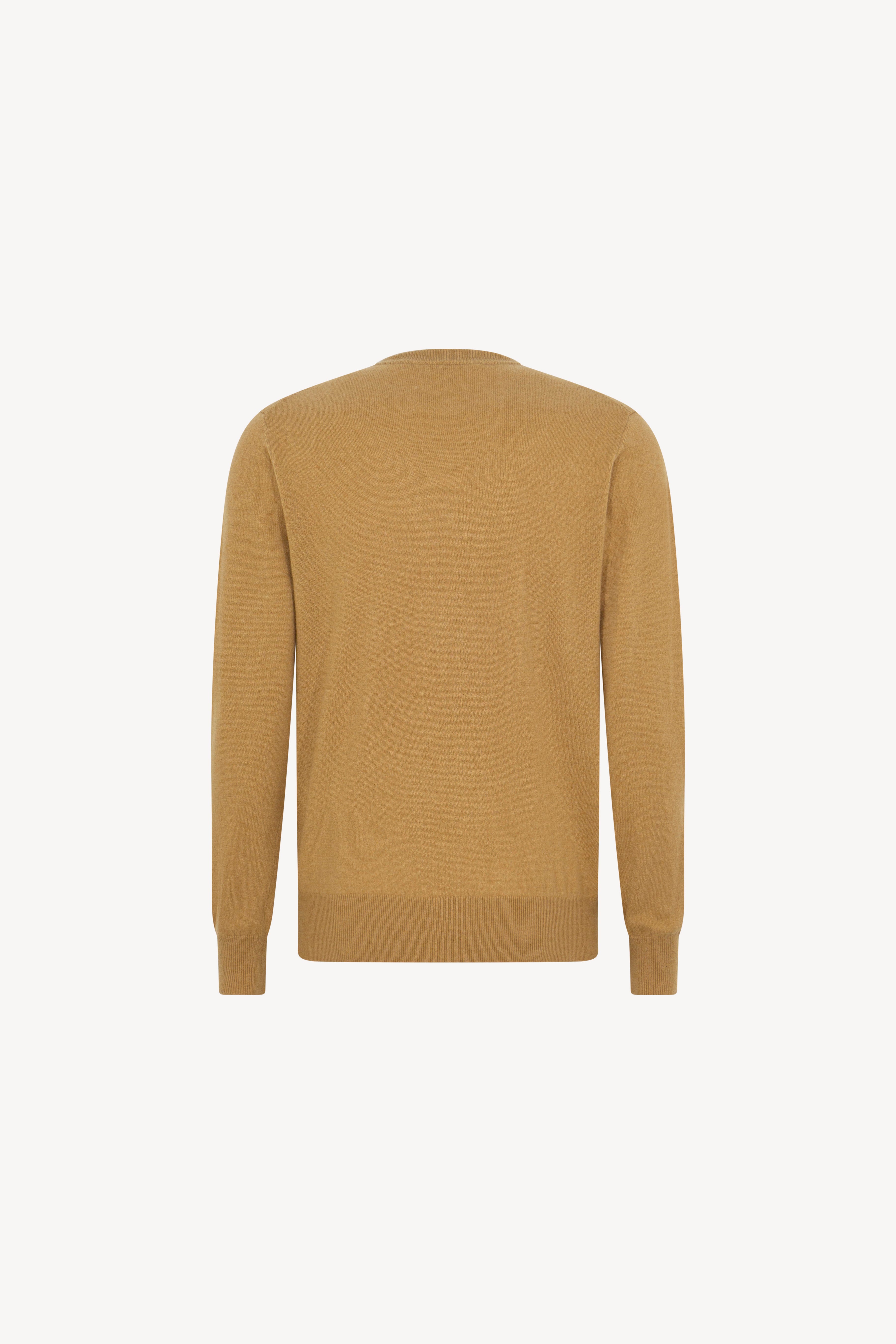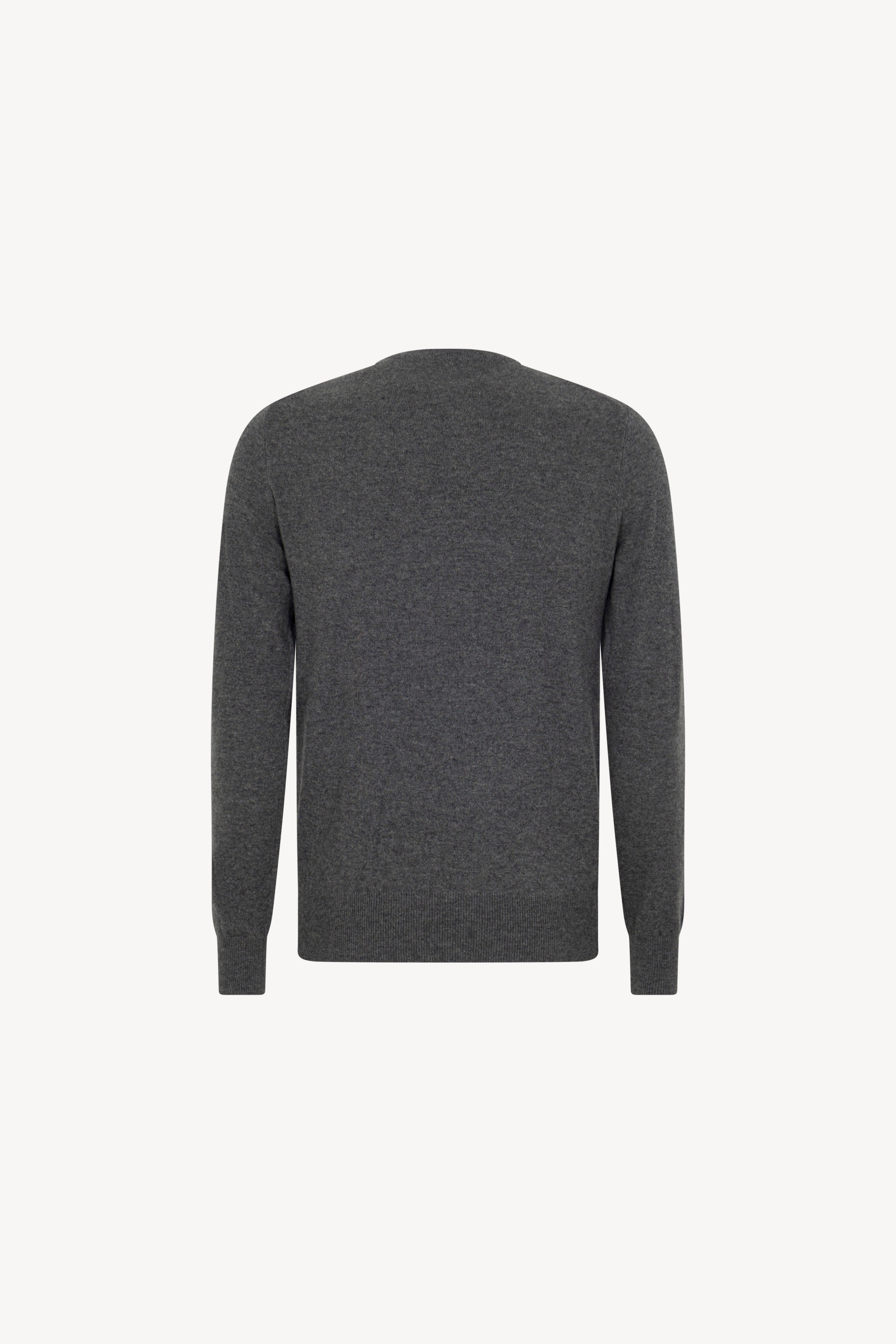 Pull girocollo in maglia rasata con collo e profili lavorati a costine. La vestibilità è regolare. Il capo è realizzato con filato 100% Cashmere 2/27 1 filo.