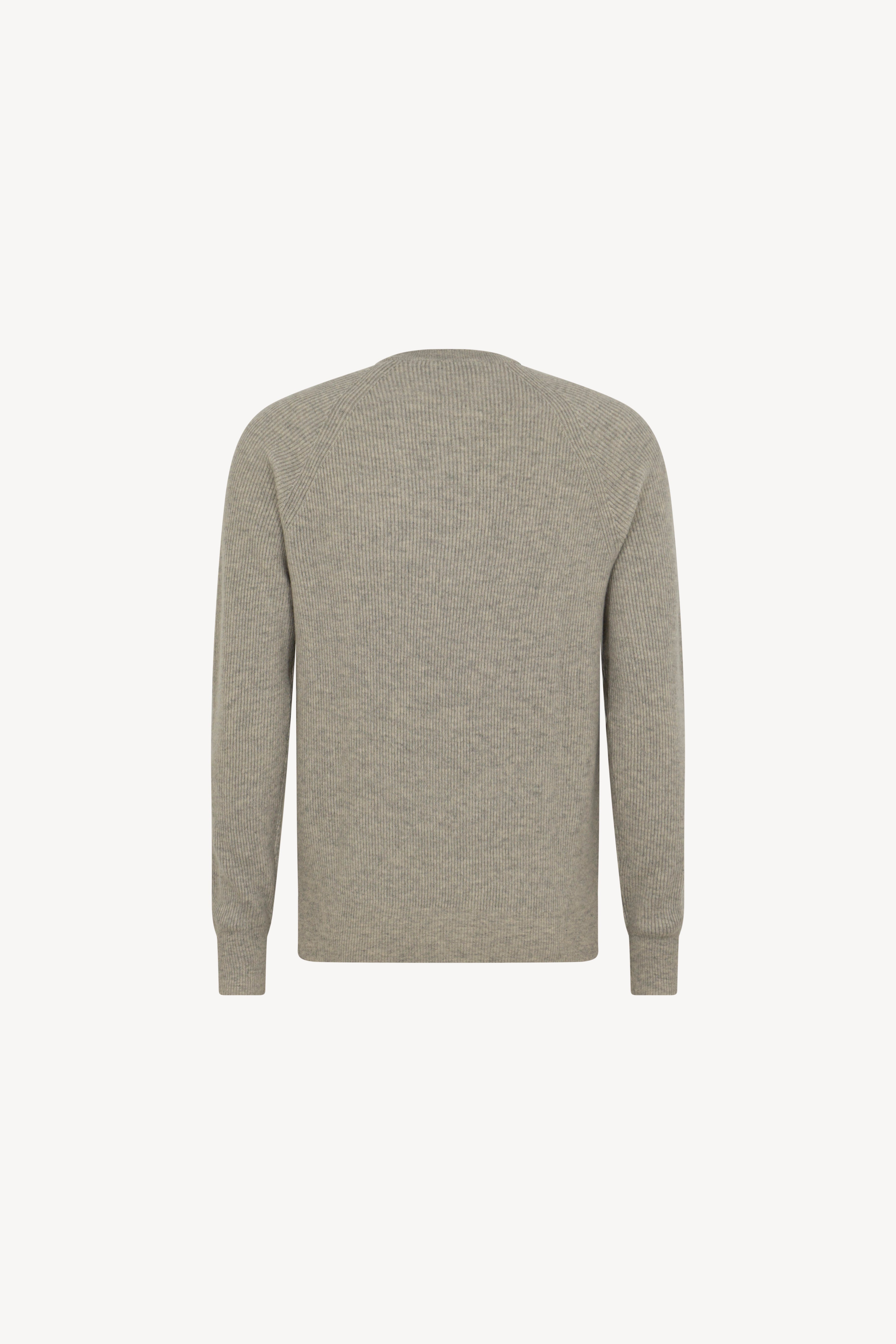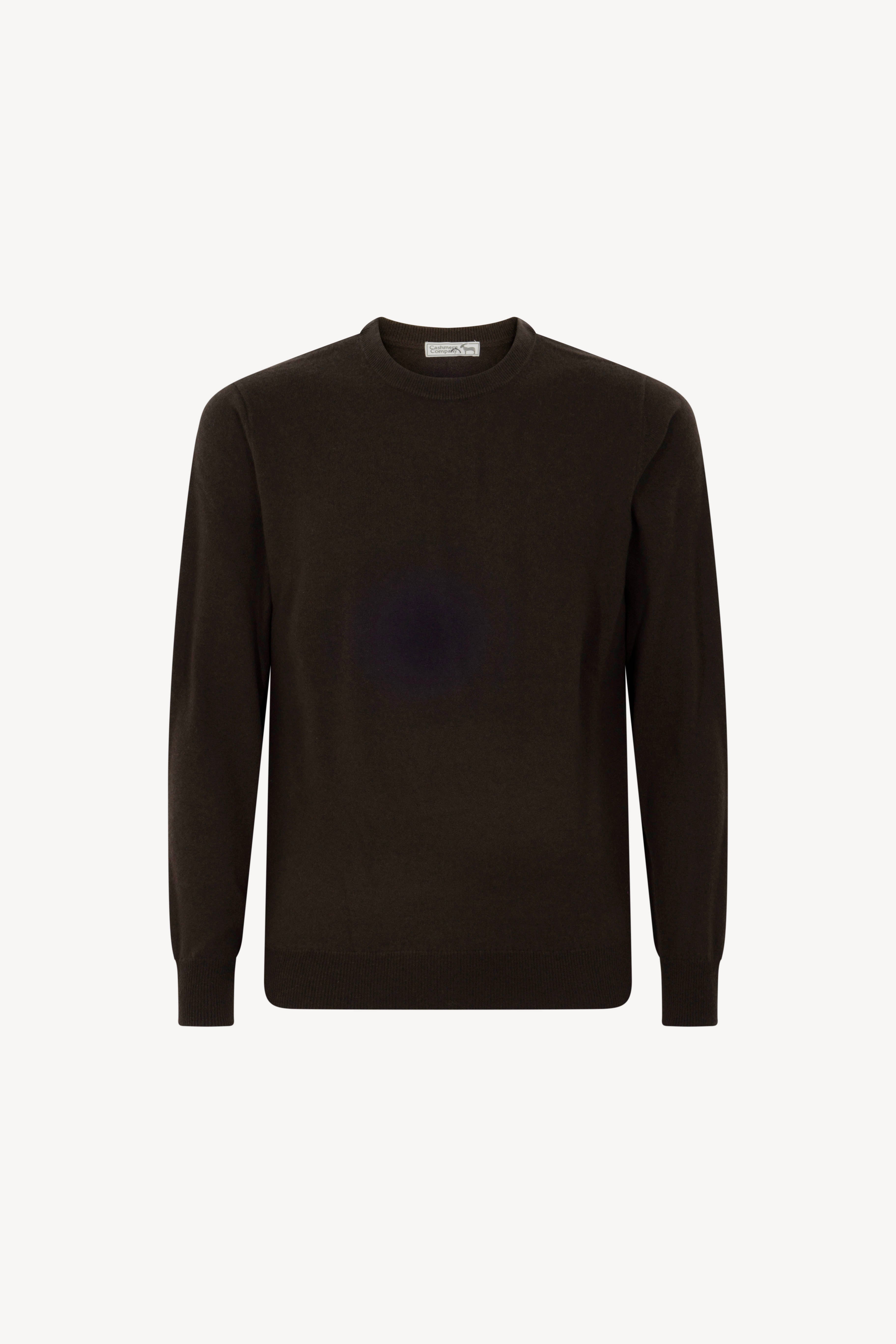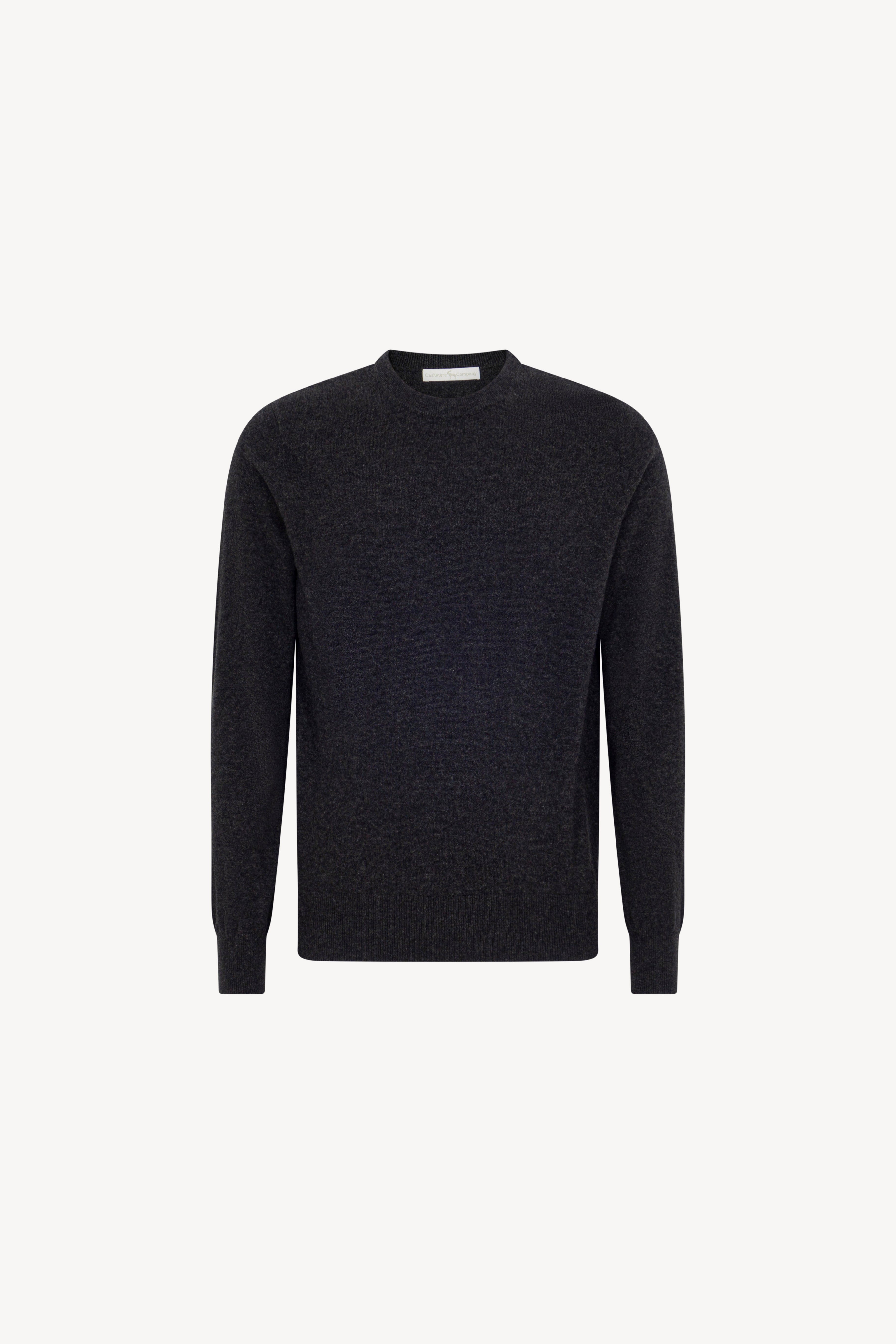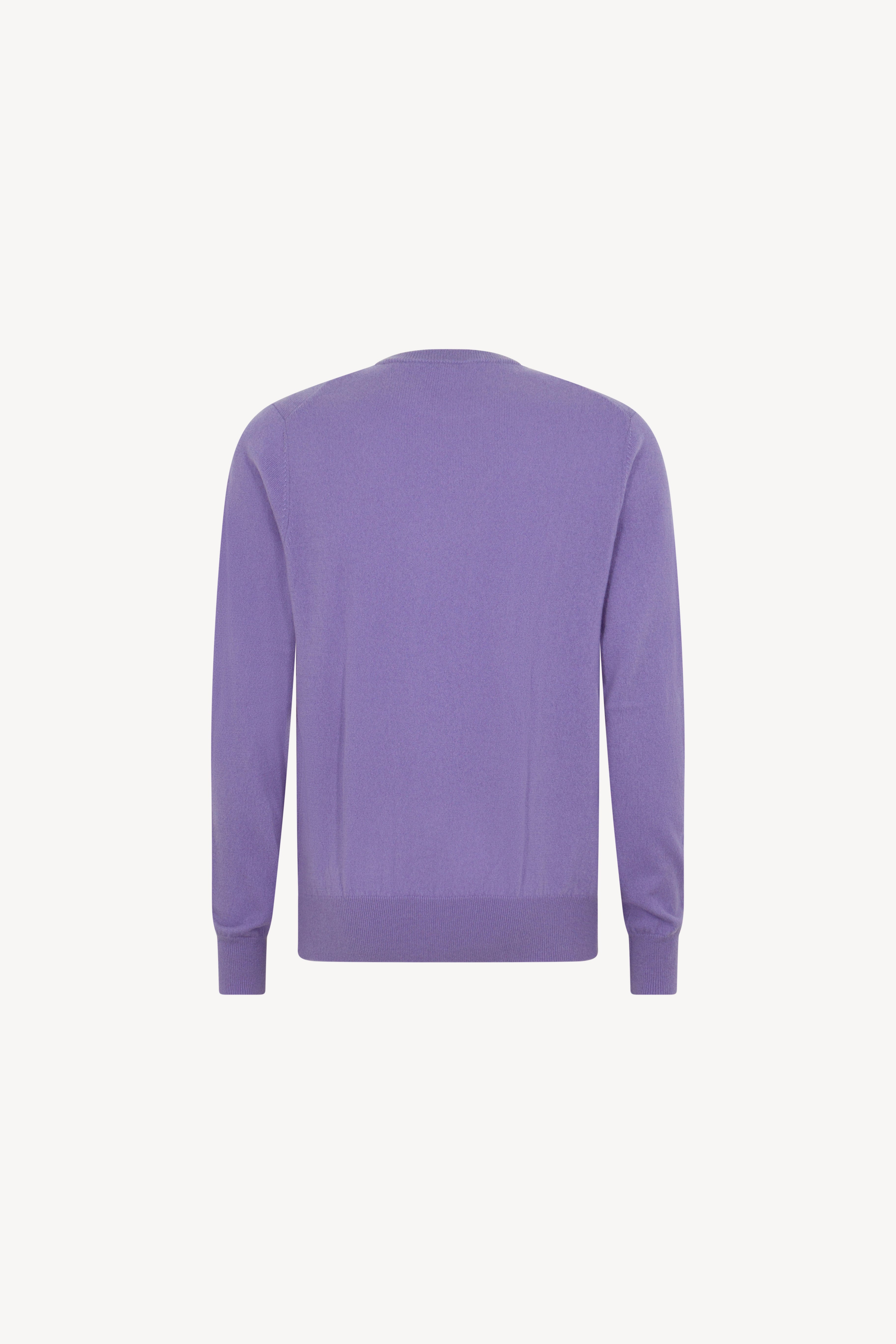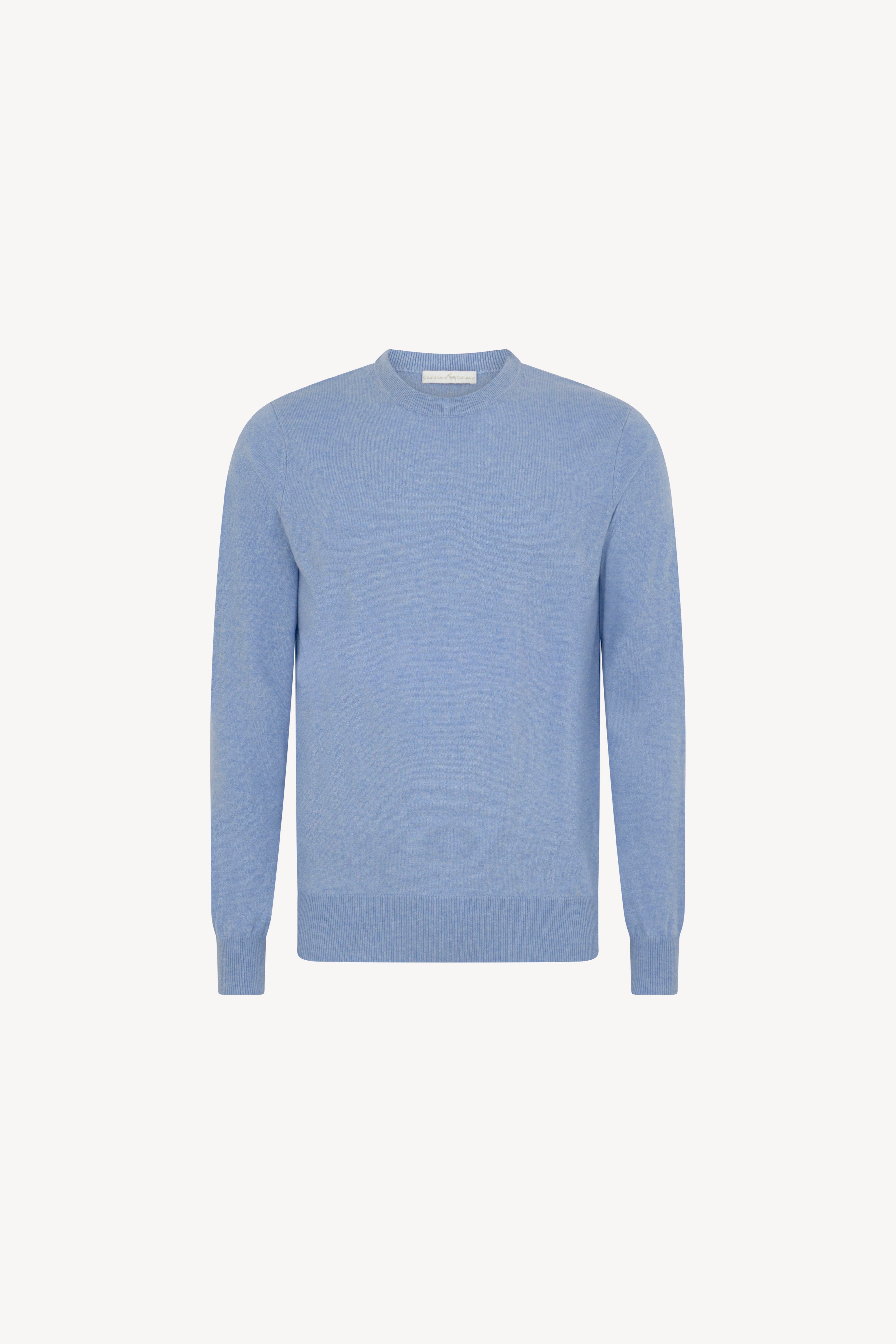 Pull girocollo in maglia rasata con collo e profili lavorati a costine. La vestibilità è regolare. Il capo è realizzato con filato 100% Cashmere 2/27 1 filo.